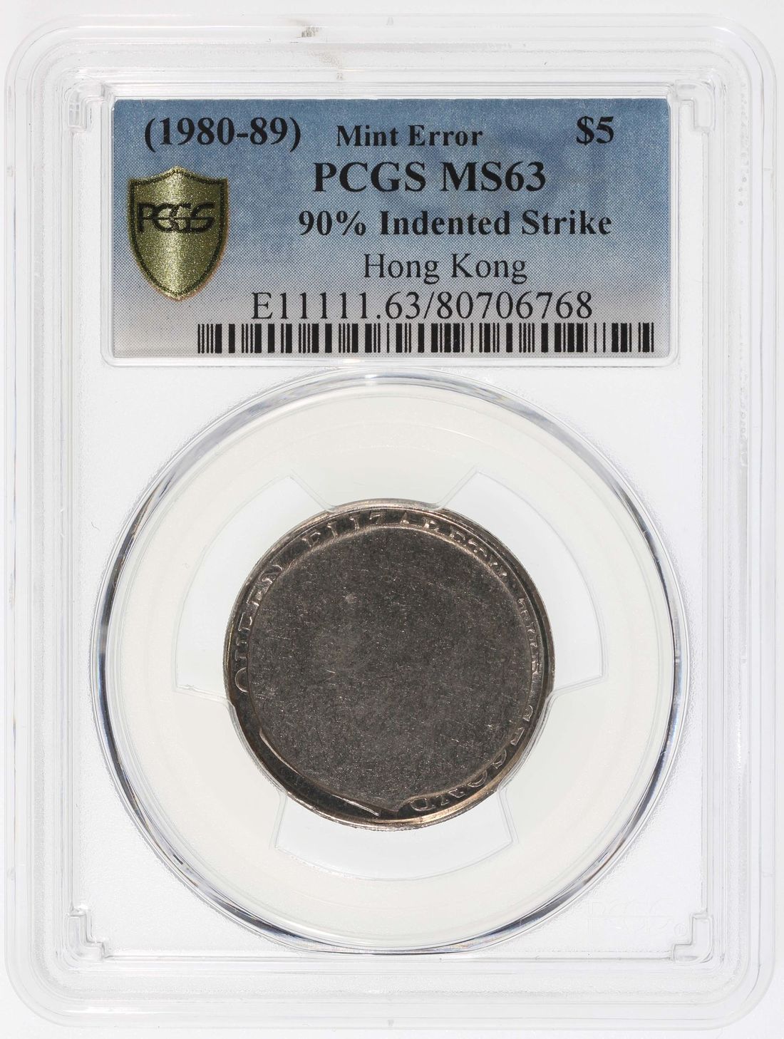 Hong Kong, [PCGS MS63] MINT ERROR $5, 1980-89, 90% indented strike, #80706768. An interesting error where most of the design is missing aside from the rim, very unusual
