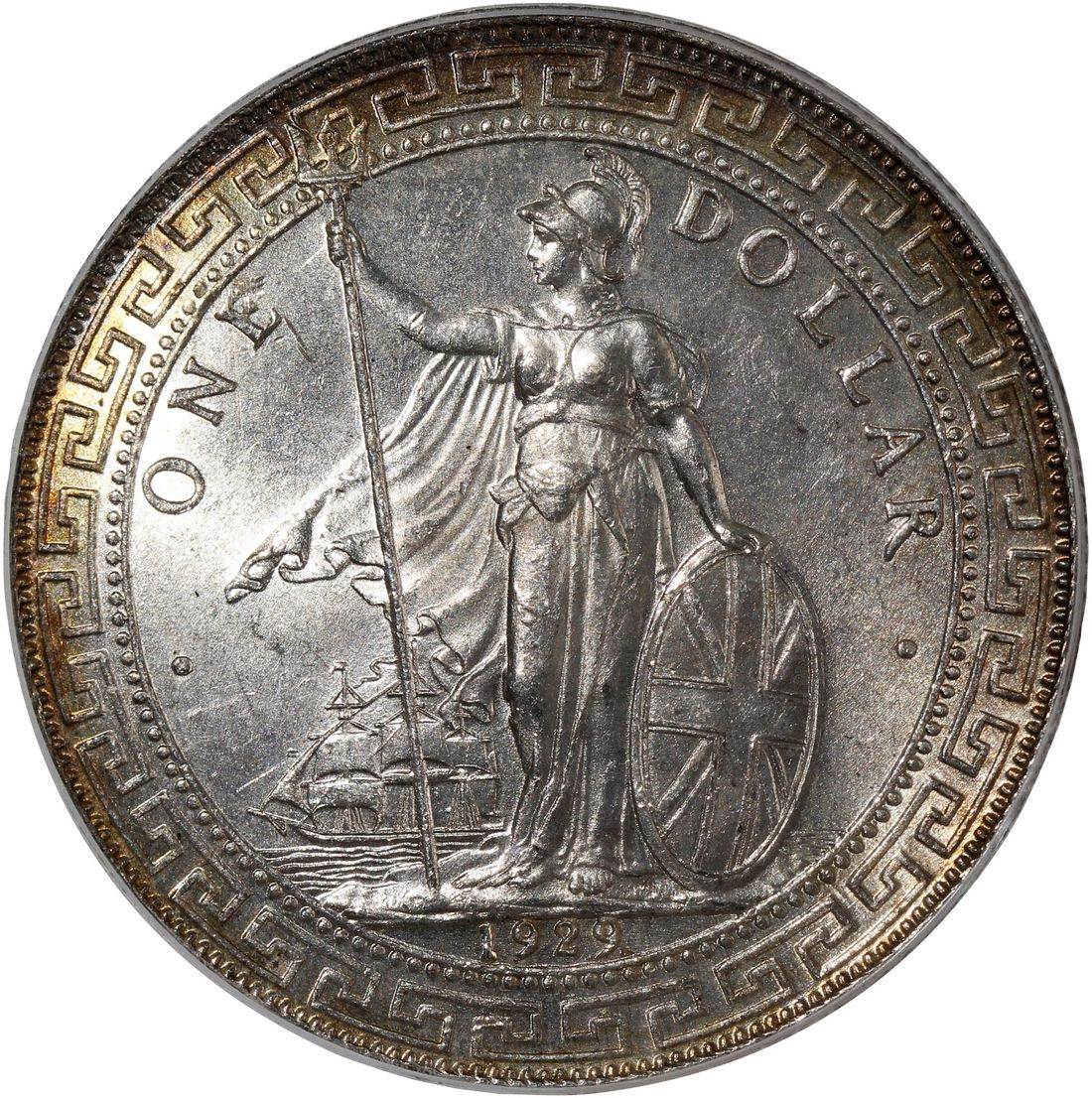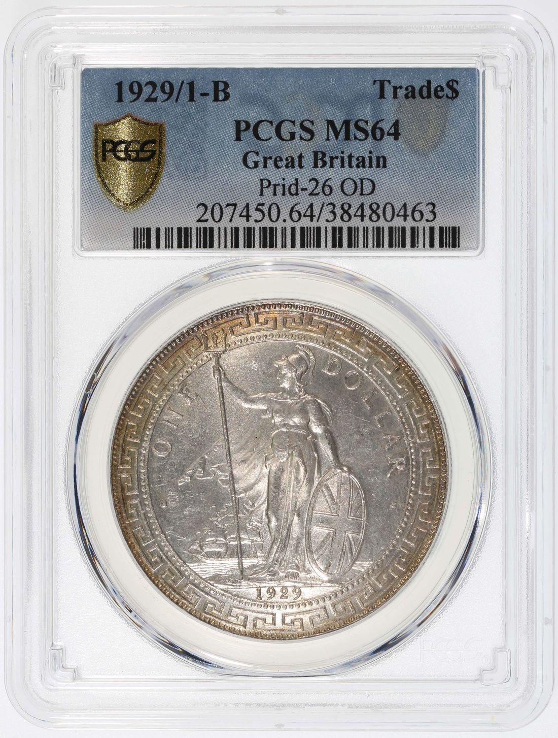 Great Britain, Trade Dollar, [PCGS MS64] 1929/1-B, overdate 9 over 1, Bombay Mint, (Pridmore-26 OD), #38480463. Lustrous mint state example with gold tones at the rim on both sides. Quite lovely!