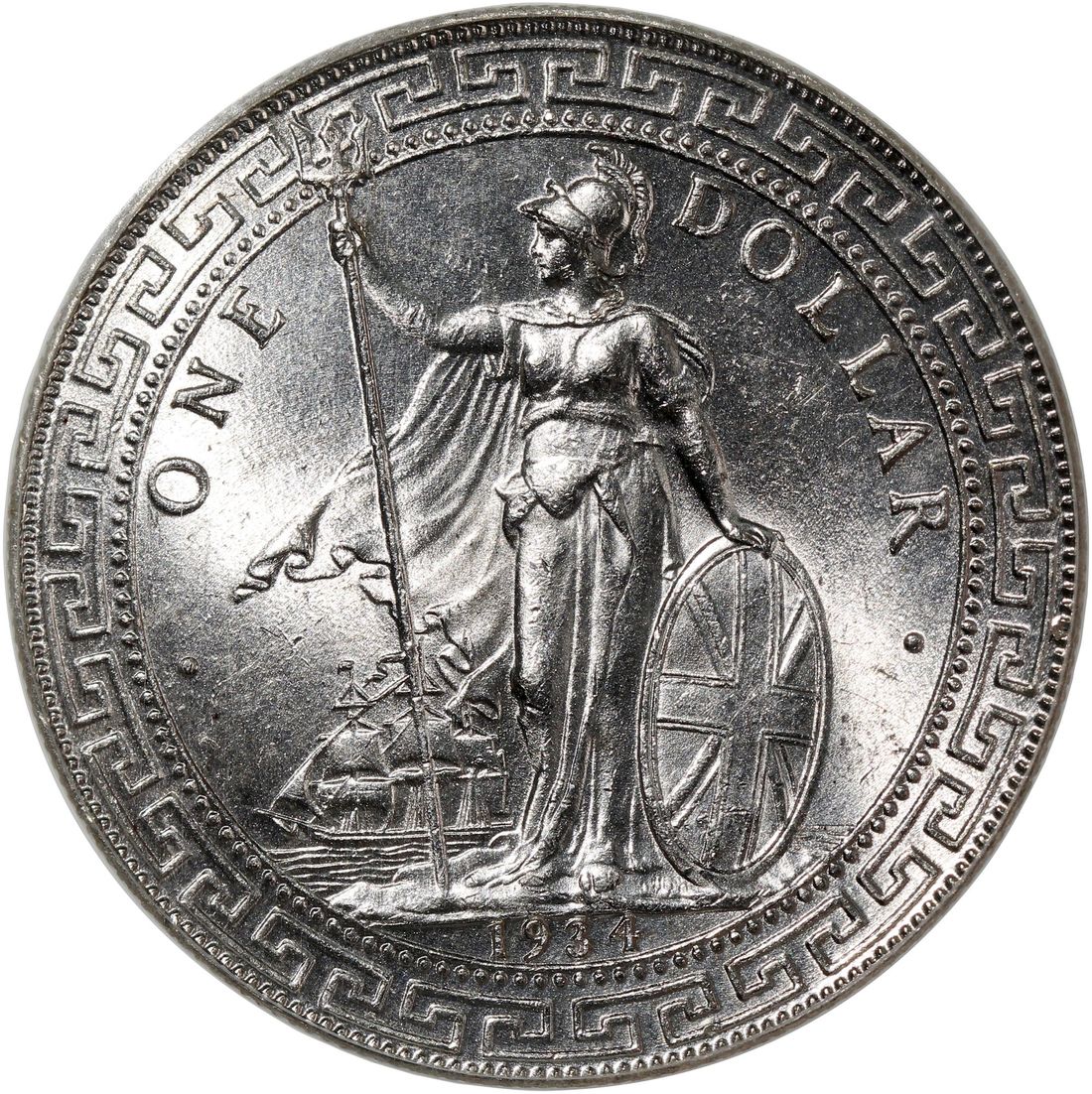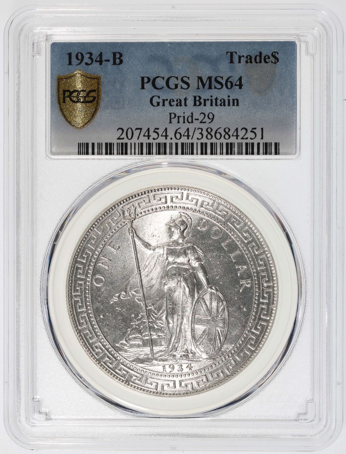 Great Britain, Trade Dollar, [PCGS MS64] 1934-B, Bombay Mint, (Pridmore-29), #38684251. The 2nd to last date of the series and one of the KEY DATE. Any mint state examples are tough to come by let alone an examples as attractive as this. A snowy apperance example with strong cartwheel luster on both sides. Not to be missed!