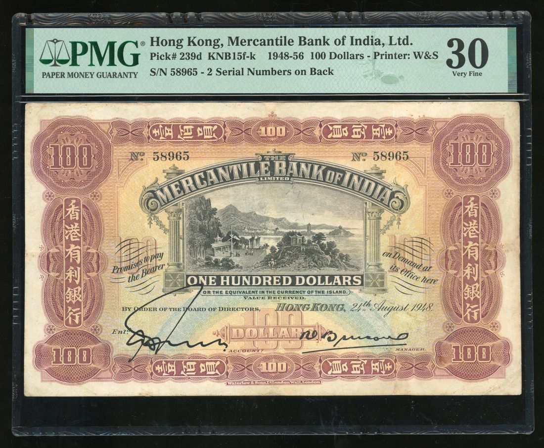 Mercantile Bank of India, Hong Kong, $100, 24.8.1948, serial number 58965, red on orange and light blue underprint, houses below mountains at centre, reverse red and black, Mercury with winged helmet at centre,
