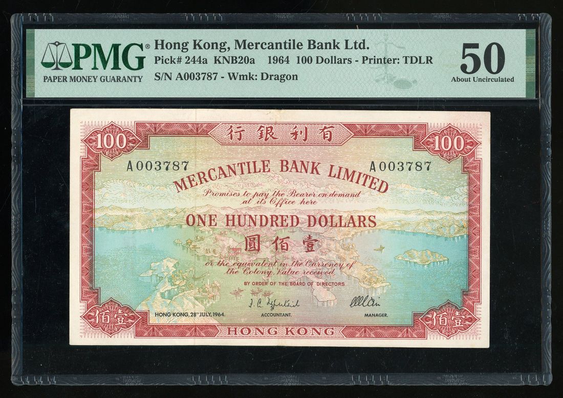 Mercantile Bank, Hong Kong, $100, 28.7.1964, serial number A003787, (Pick 244a), PMG 50, original about uncirculated, rare first year issue.