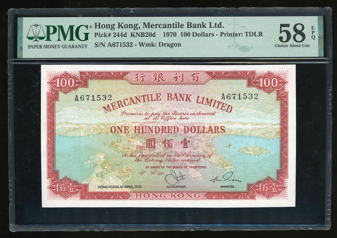 Mercantile Bank, Hong Kong, $100, 16.4.1970, serial number A 671532, 'map', (Pick 244d), PMG 58EPQ. Original example, consecutive to the next lot