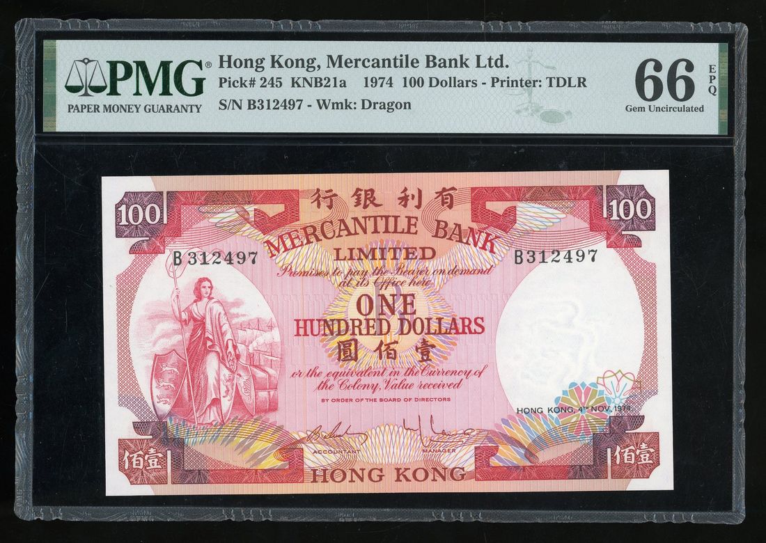 Mercantile Bank Limited, Hong Kong, $100, 4.11.1974, serial number B312497, (Pick 245), PMG 66EPQ
