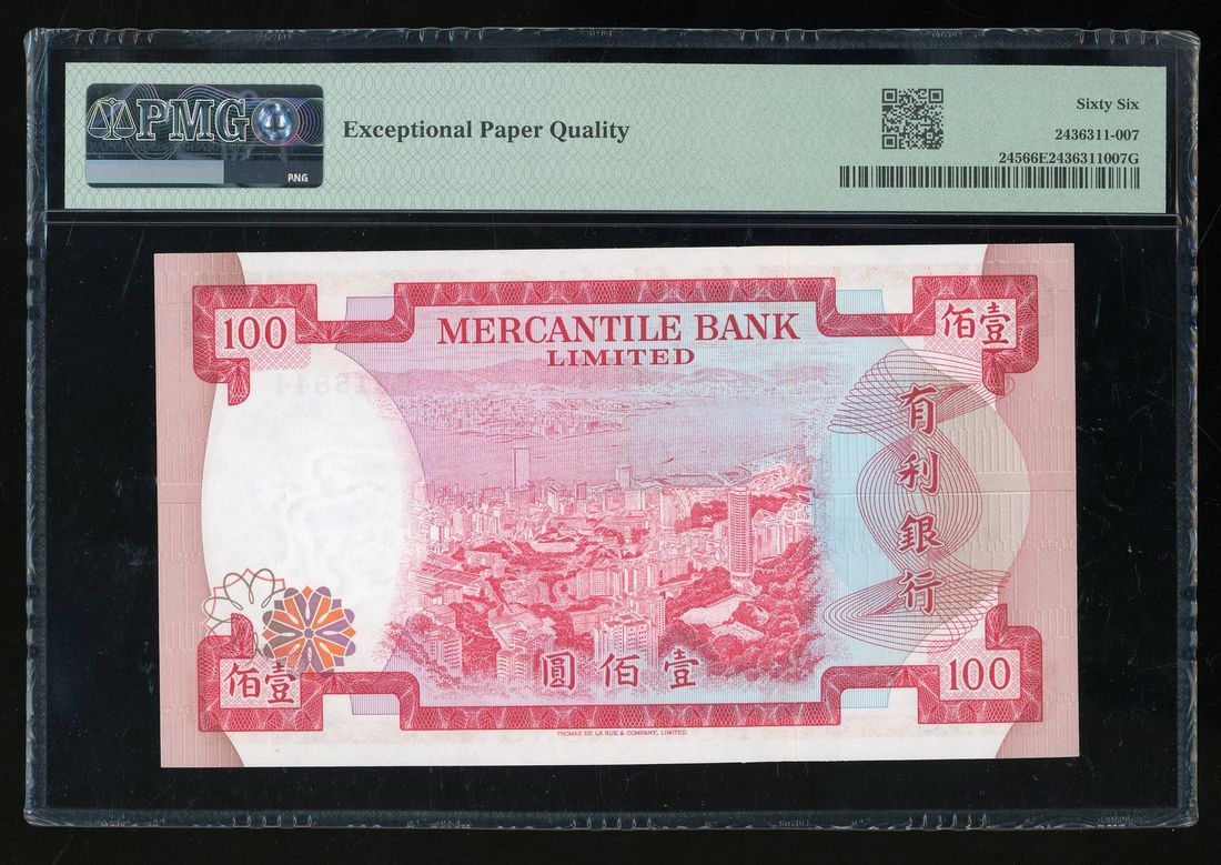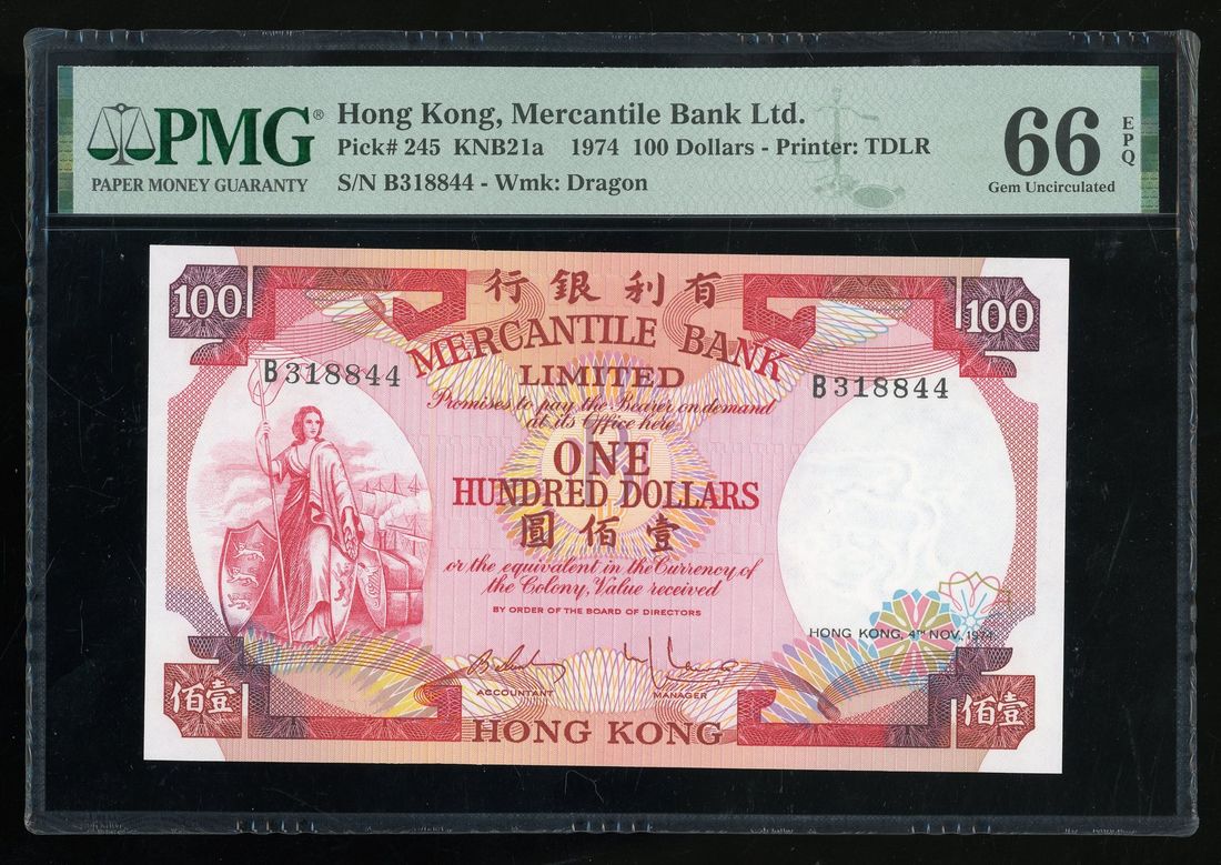 Mercantile Bank, Hong Kong, $100, 4.11.1974, serial number B318844, (Pick 245), PMG 66EPQ