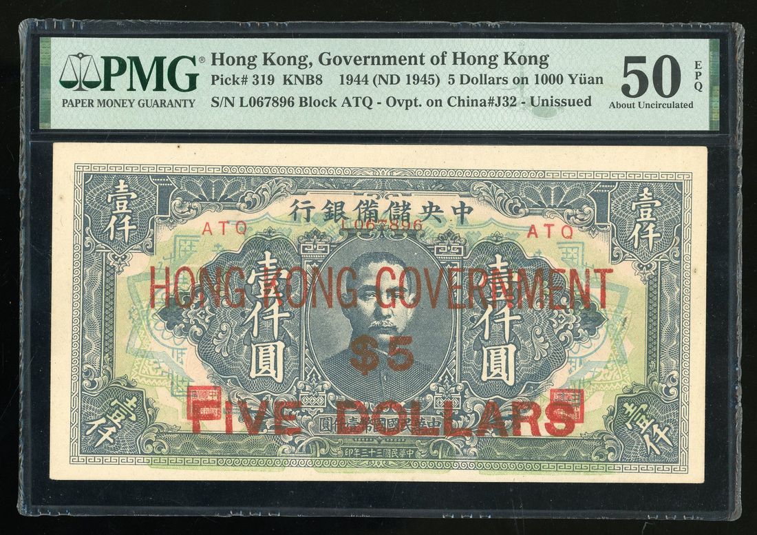 Government of Hong Kong, $5, emergency issue overprinted on The Central Reserve Bank of China 1000 yuan, 1944 (1945), serial number L 067896, block number ATQ,