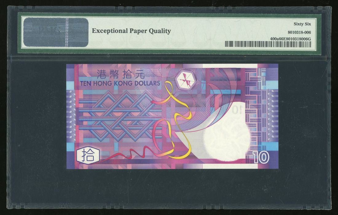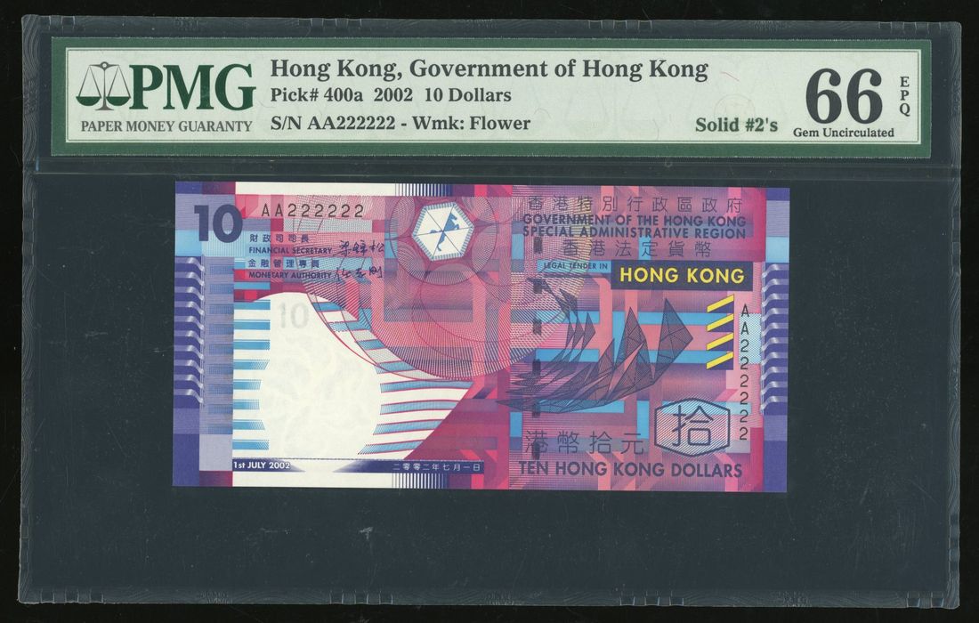 Government of HongKong, $10, 2002, solid serial number AA222222, (Pick 400a), PMG 66EPQ. First series solid numbers rare