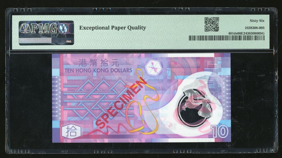 (Pick 401ds), PMG 66EPQ. First prefix. The government issue polymer $10 remains the only polymer note from Hong Kong to this day. Where specimens of the paper notes are scarce, the rarity of polymer specimen issue increases tenfold. PMG census one of only two and this the higher grade example. First time seen in the market! Very important!