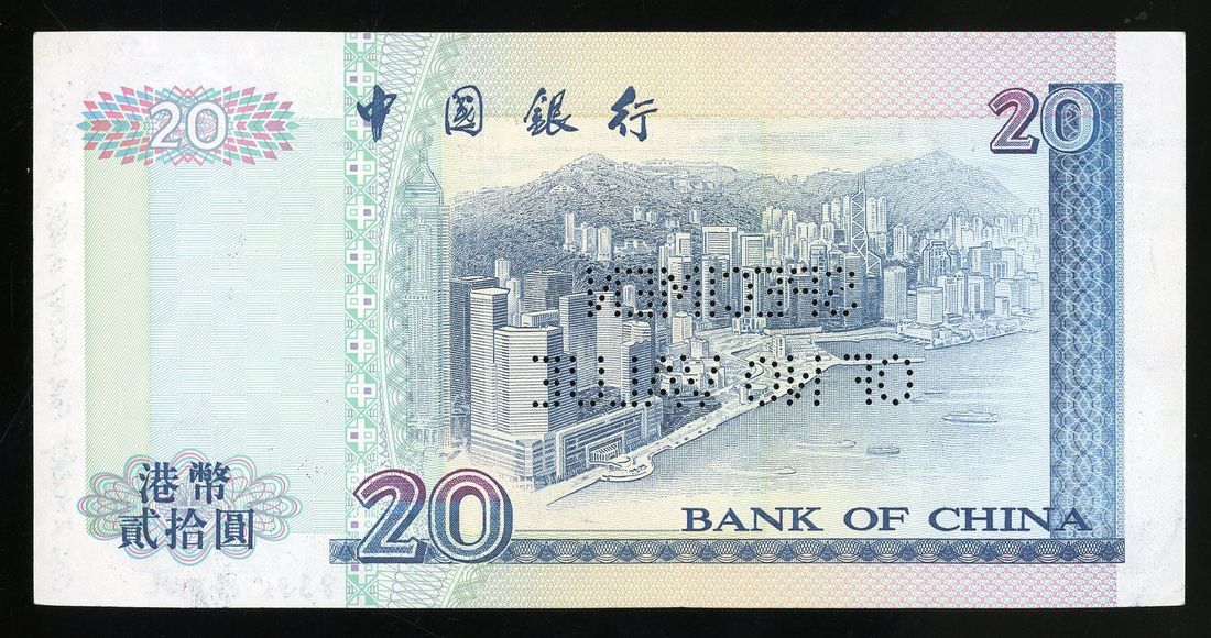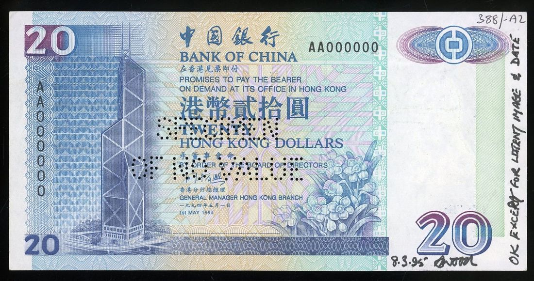 Bank of China, Hong Kong, specimen $20, 1.5.1994, serial number AA000000, (Pick 329as), about extremely fine, perforated, with printer's annotations. Interestingly hand dated 1995. All Bank of China specimens rare. Intriguing