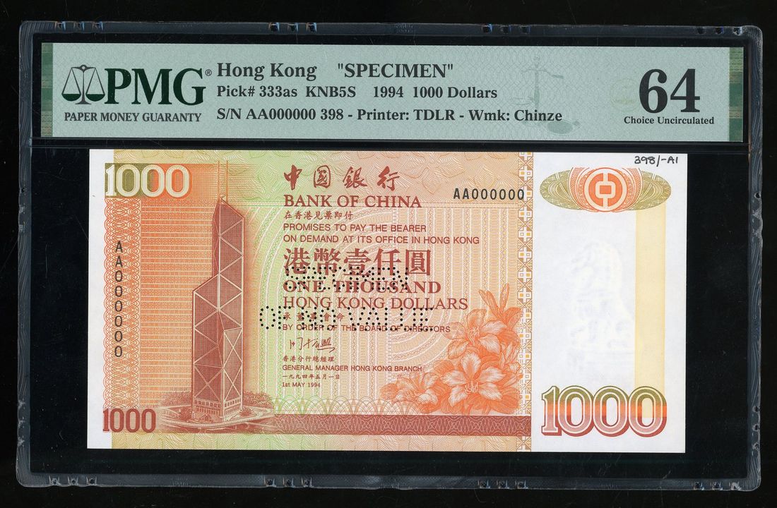Bank of China, Hong Kong, specimen $1000, 1.5.1994, serial number AA000000, (Pick 333as), PMG 64, annotation. All Bank of China specimens generally rare especially this top denomination of the first ever issue.
