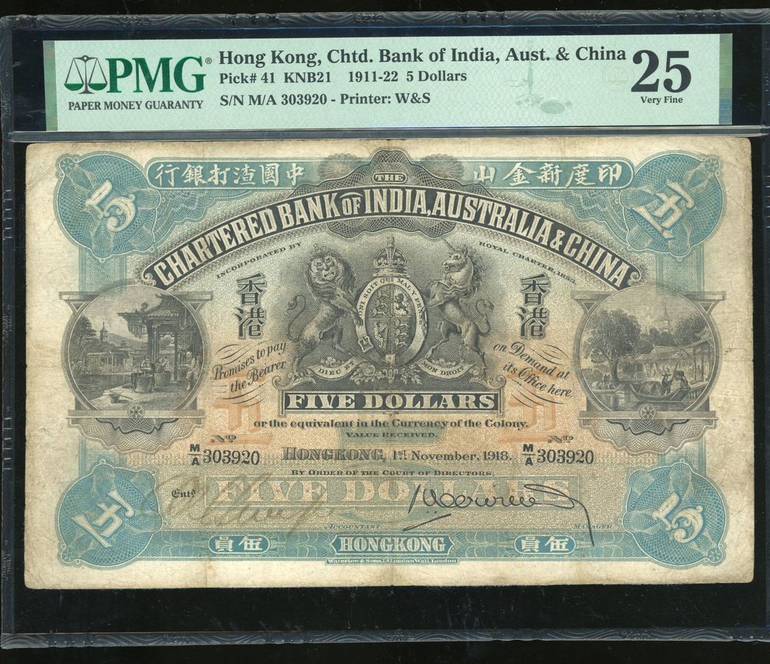 Chartered Bank of India, Australia and China, Hong Kong, $5, 1.11.1918, serial number M/A 303920, hand signed signature at lower left, blue and black, bank coat of arms at centre, rice pounding scene and sampans at left and right respectively, reverse red and black, bank building at centre,