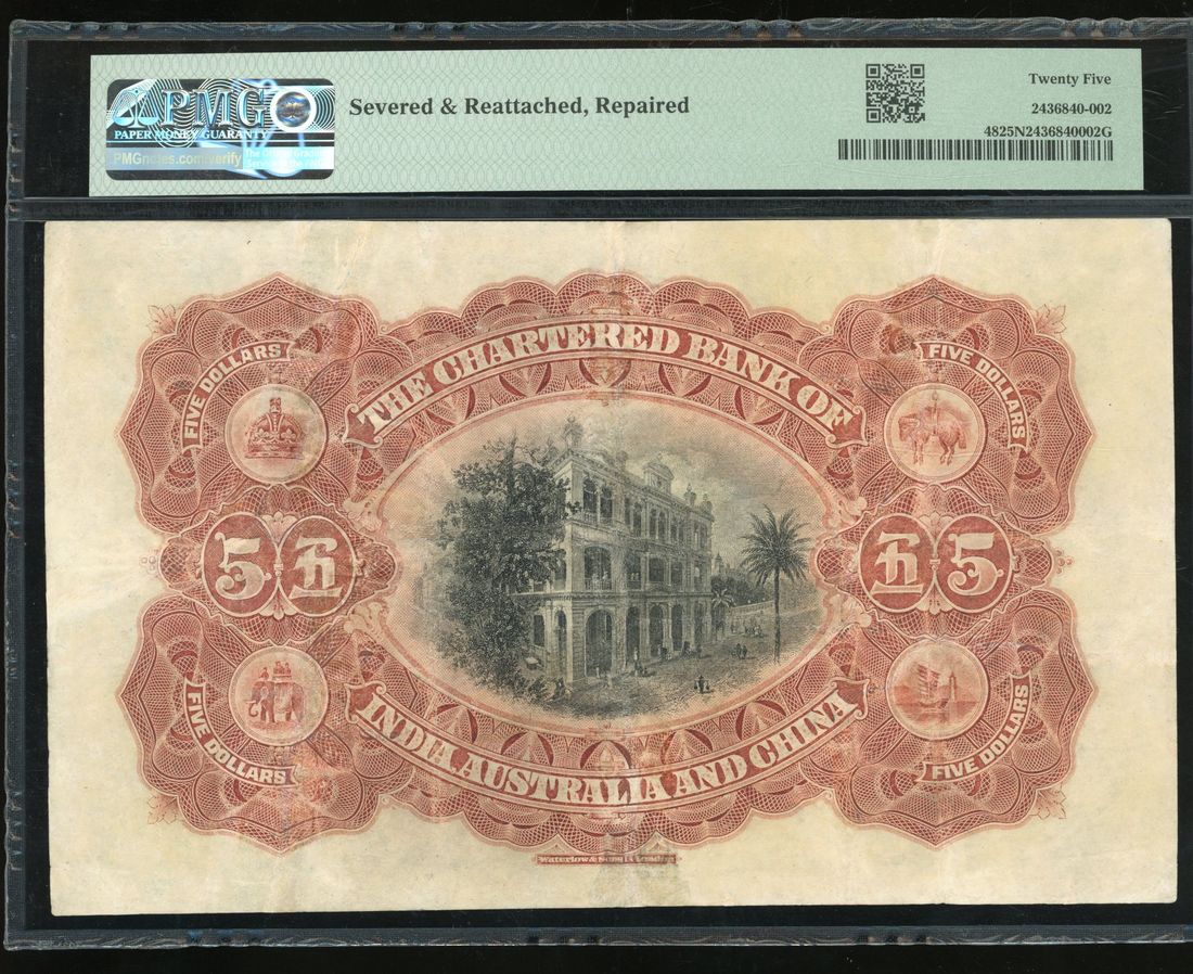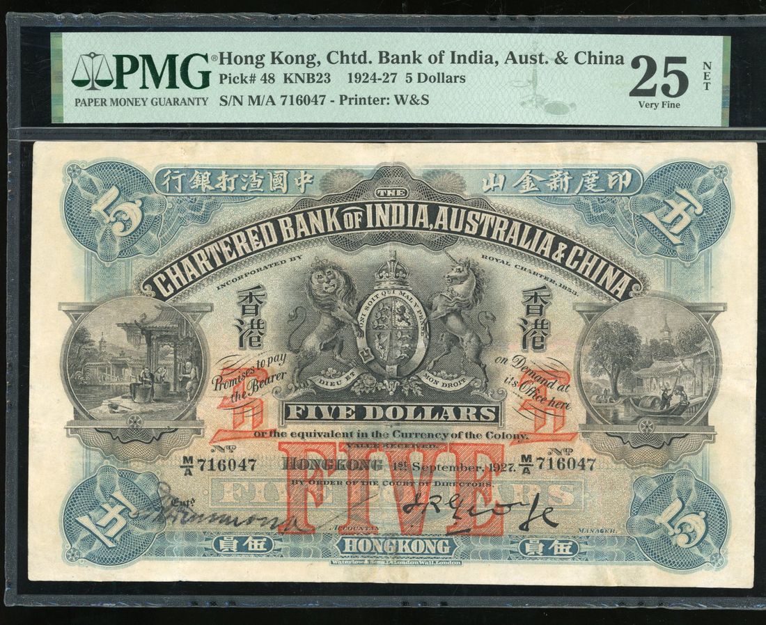 Chartered Bank of India, Australia & China, Hong Kong, $5, 1.9.1927, serial number M/A 716047, one handsigned signature,