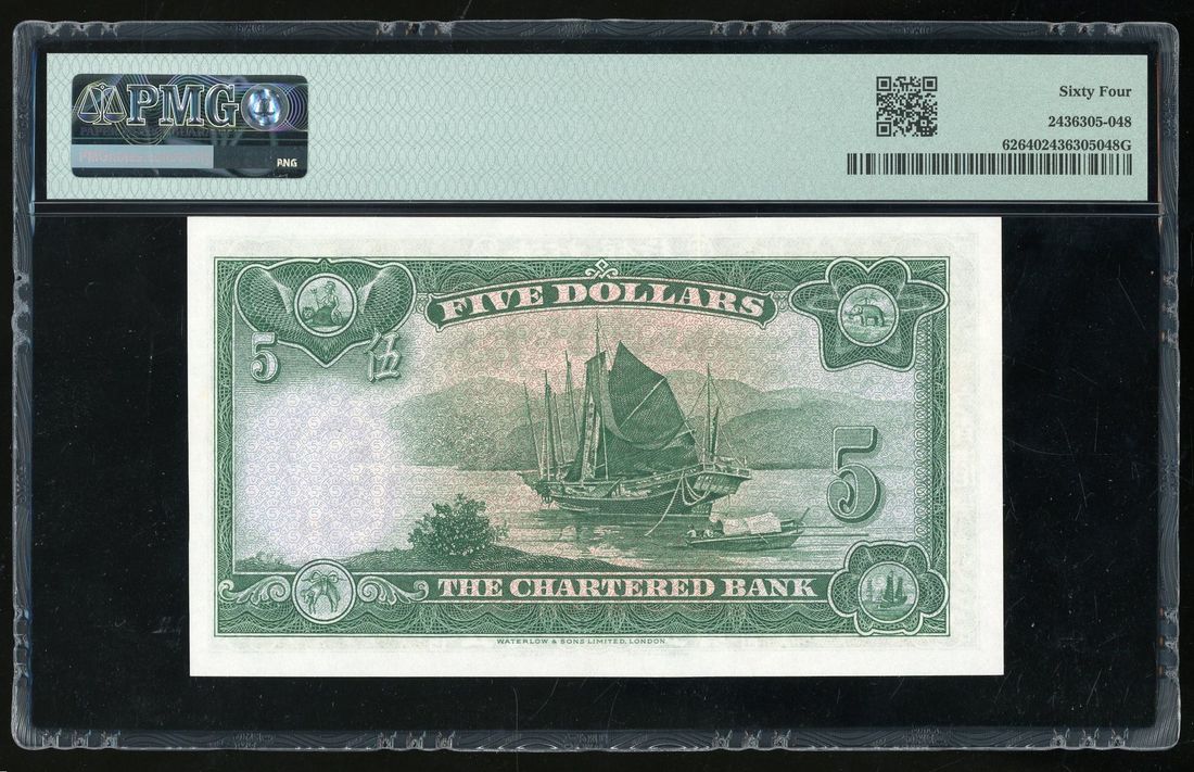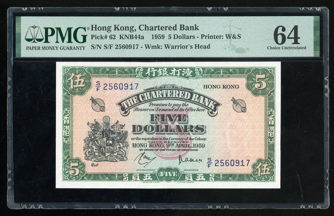 Chartered Bank, Hong Kong, $5, 9.4.1959, serial number S/F 2560917, (Pick 62), PMG 64