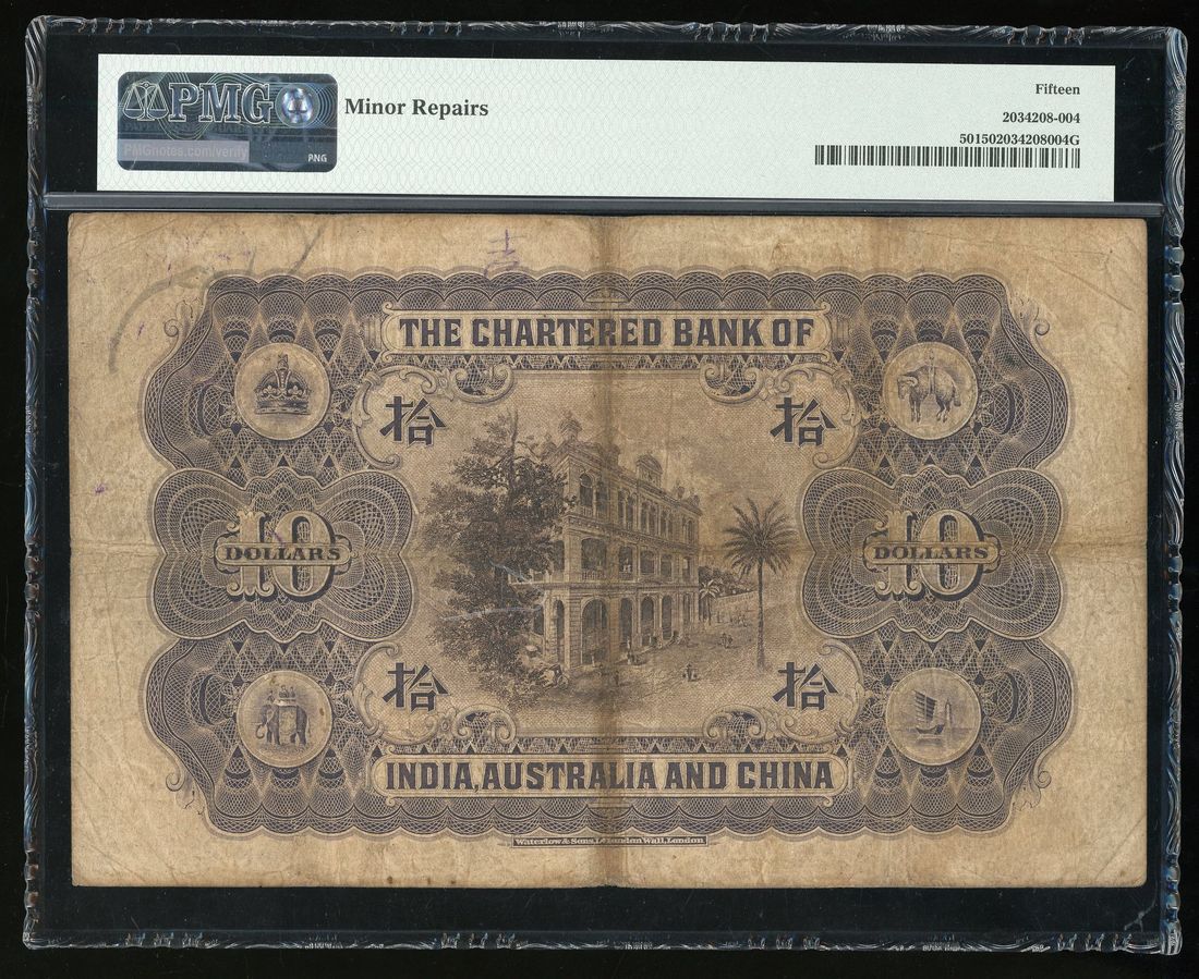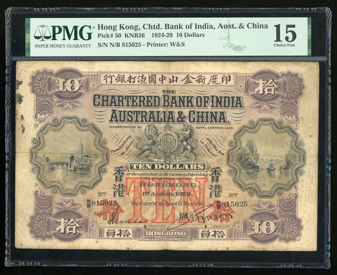 Chartered Bank of India, Australia & China, Hong Kong, $10, 1.8.1929, serial number N/B 815025, one handsigned signature,