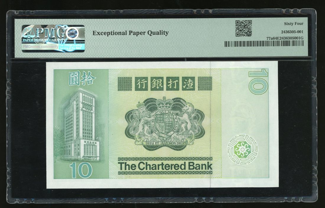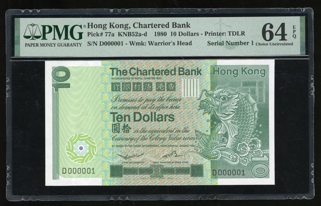 Chartered Bank, Hong Kong, $10, 1.1.1980, low serial number D000001, (Pick 77a), PMG 64EPQ. First note of the D prefix series