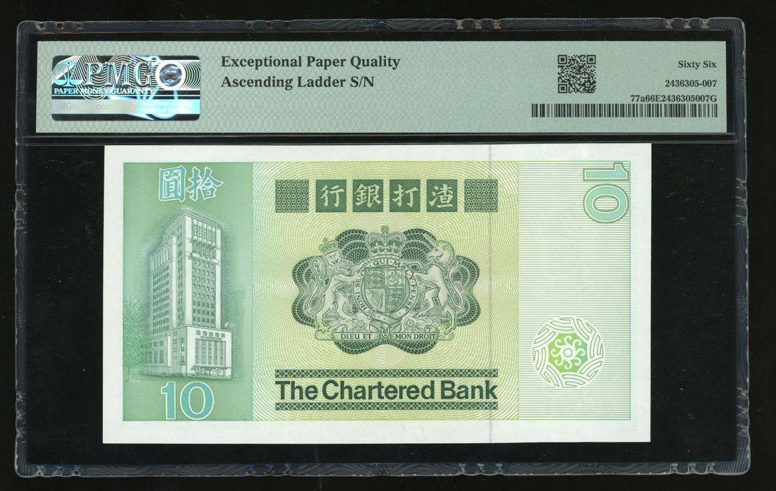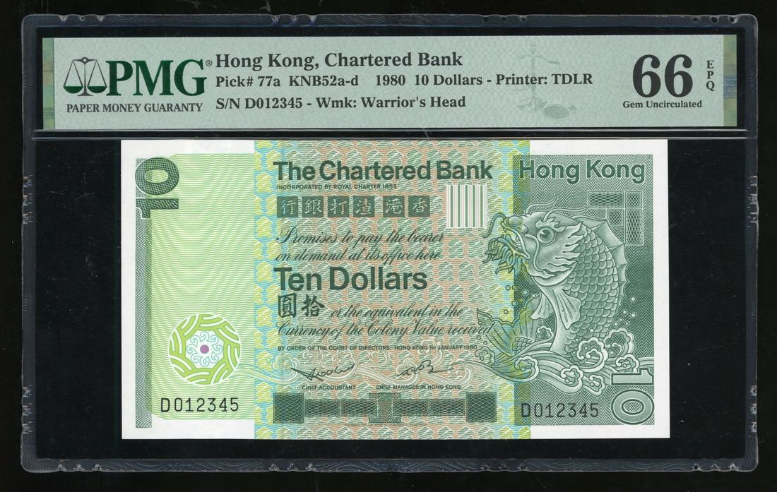 Chartered Bank, Hong Kong, $10, 1.1.1980, ascending ladder serial number D012345, (Pick 77a), PMG 66EPQ.
