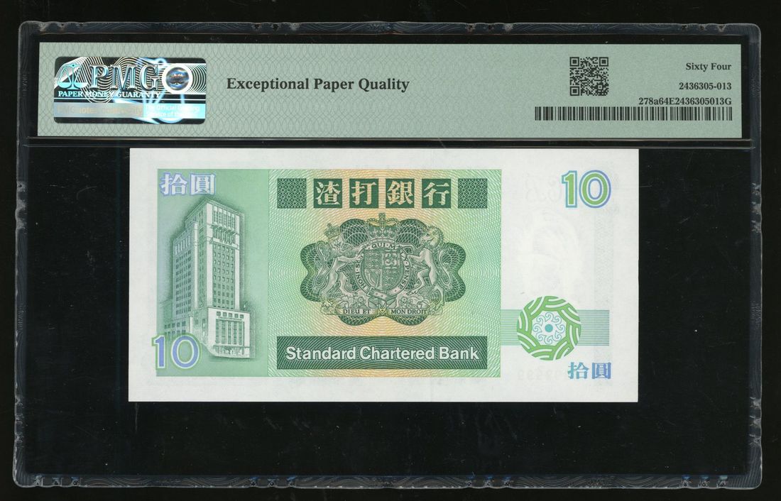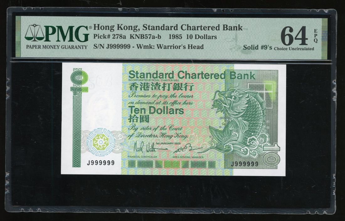 Standard Chartered Bank, Hong Kong, $10, 1.1.1985, solid serial number J999999, (Pick 278a), PMG 64EPQ.