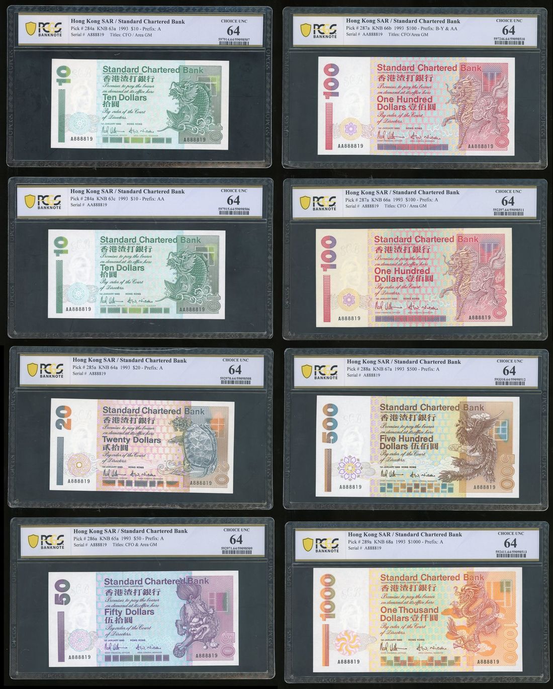 Standard Chartered Bank, Hong Kong, a matching serial number 888819 set, 1993, including, $10 (2), $20, $50, $100 (2), $500 and $1000, each with A or AA prefix,