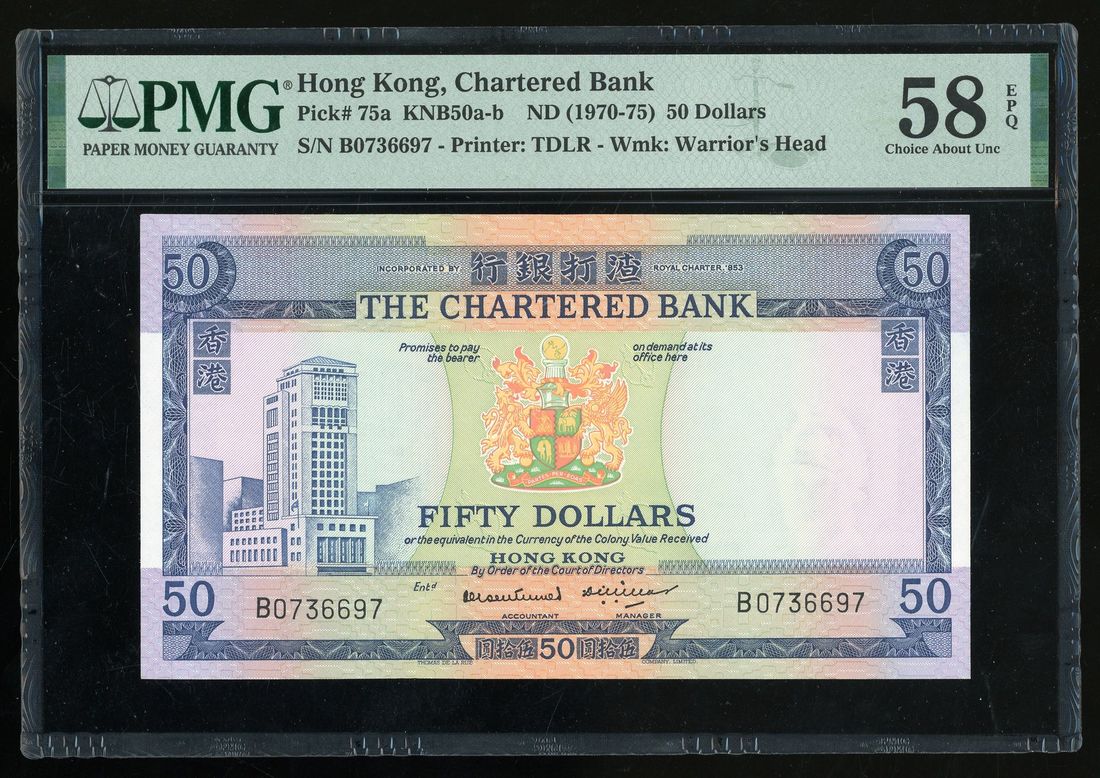 Chartered Bank, Hong Kong, $50, ND (1970-75), serial number B0736697, (Pick 75a), PMG 58EPQ