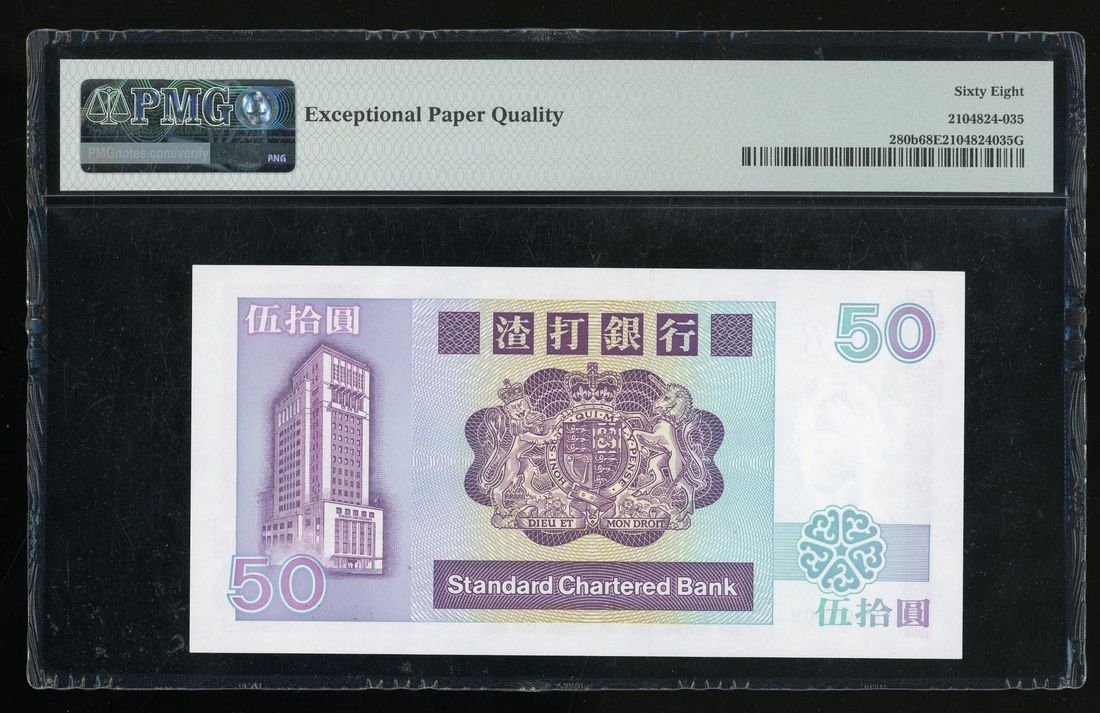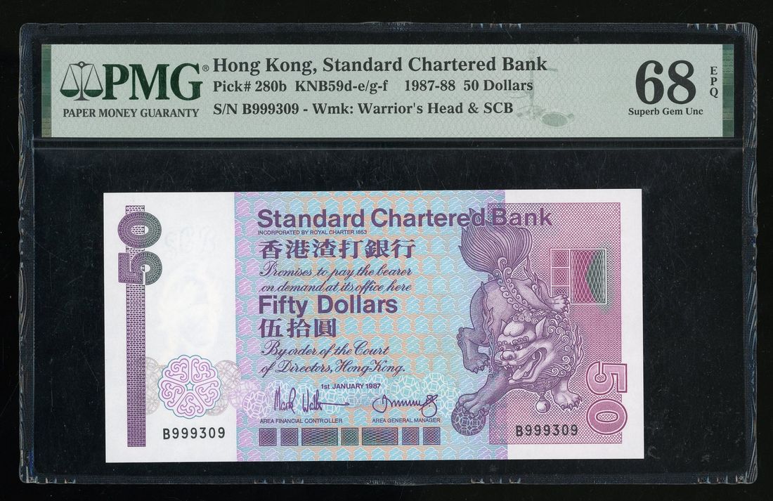 Standard Chartered Bank, Hong Kong, $50, 1.1.1987, serial number B 999309, (Pick 280b), PMG 68EPQ, key date