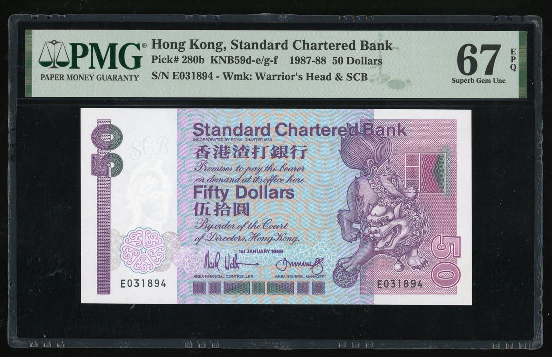 Standard Chartered Bank, Hong Kong, $50, 1.1.1988, serial number E031894, (Pick 280b), PMG 67EPQ. Key prefix/date