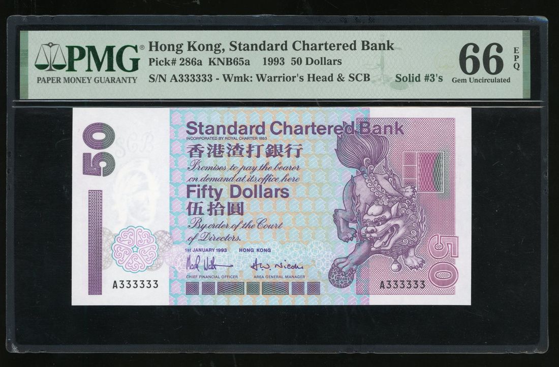 Standard Chartered Bank, Hong Kong, $50, 1.1.1993, solid serial number A333333, (Pick 286a), PMG 66EPQ. Generally single prefix solid serial numbers are scarce alone but none comes close to this 'A' FIRST PREFIX! Surely highly attractive for the solid collectors out there!