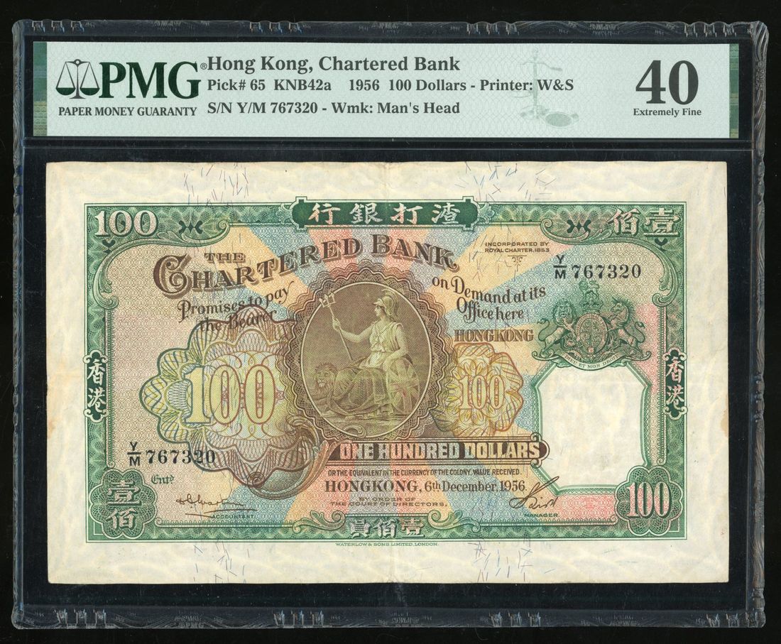 Chartered Bank, Hong Kong, $100, 6.12.1956, serial number Y/M 767320, (Pick 65), PMG 40. Well above average example for this ever popular type. PMG census with only 20 better examples
