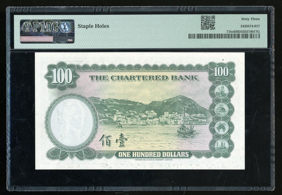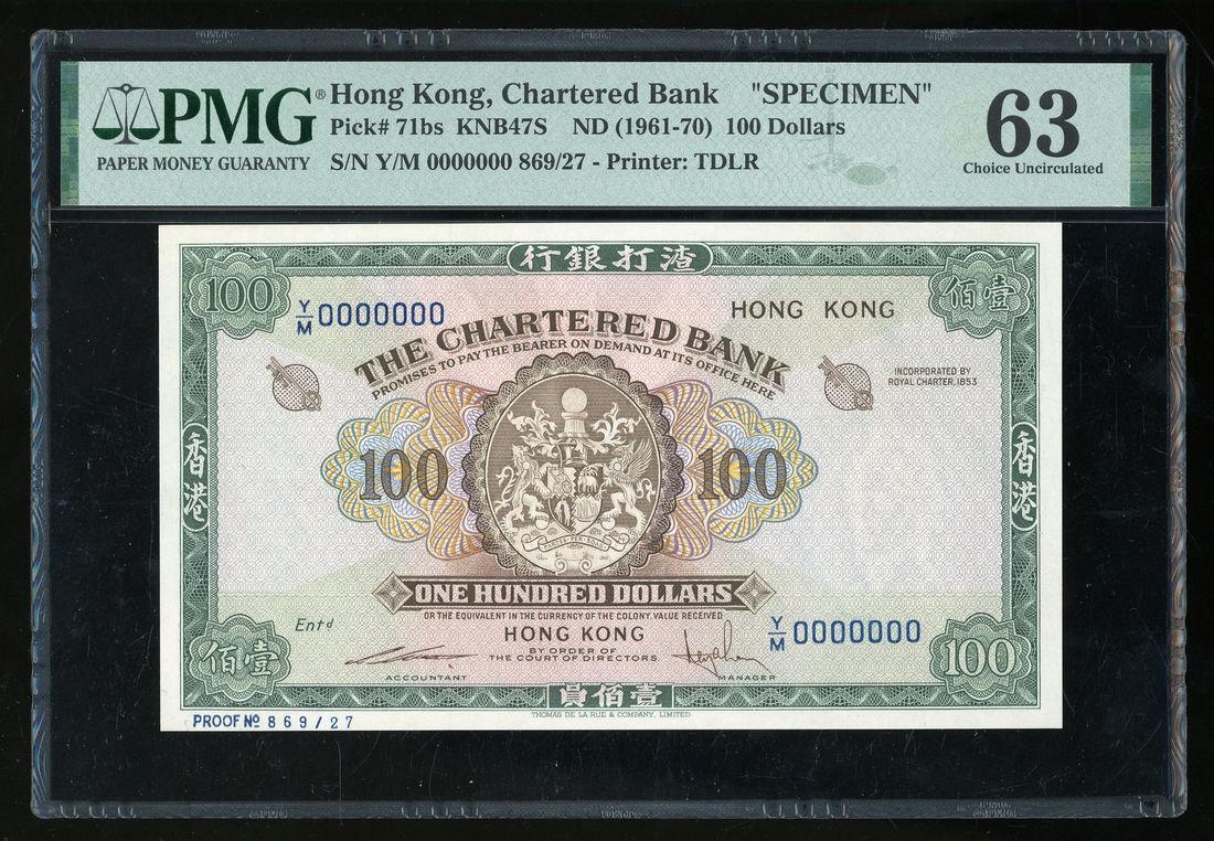 Chartered Bank, Hong Kong, specimen $100, ND (1961-70), serial number Y/M 0000000, proof no. 869/27, (Pick 71bs), PMG 63, staple holes