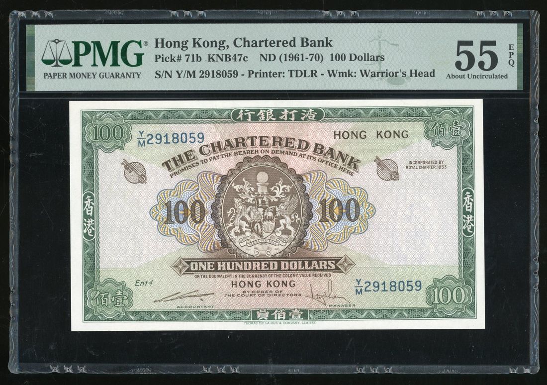 Chartered Bank, Hong Kong, $100, ND (1961-70), serial number Y/M 2918059, (Pick 71b), PMG 55EPQ. Original about uncirculated examples getting scarcer
