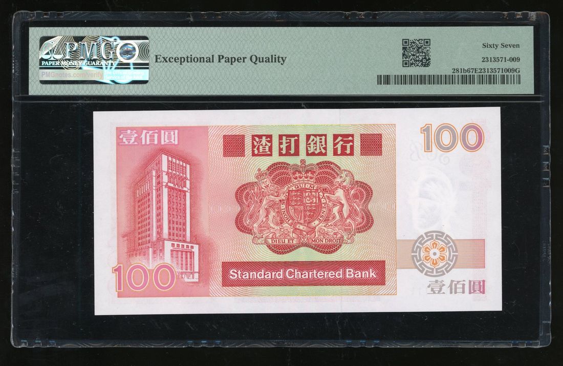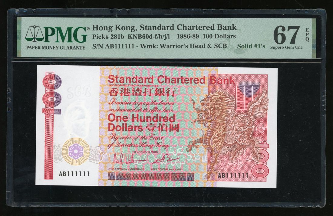 Standard Chartered Bank, Hong Kong, $100, 1.1.1986, solid serial number AB111111, (Pick 281b), PMG 67EPQ