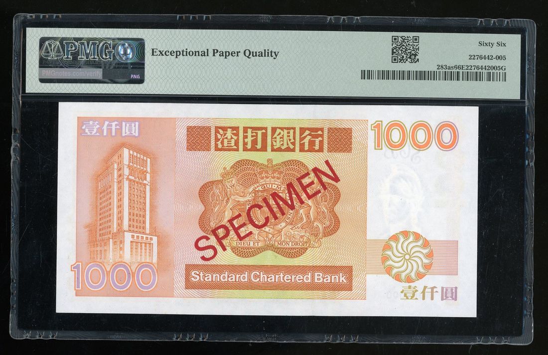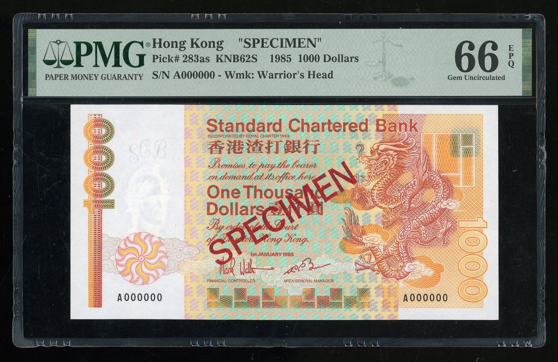 Standard Chartered Bank, specimen $1000, 1.1.1985, serial number A000000, orange/yellow, dragon at right,