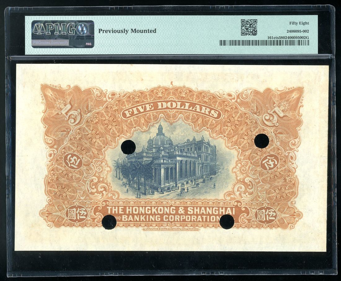 (Pick 161cts), PMG 58, previously mounted. Noted mounting though very minor but unavoidable as colour trials were often mounted on booklets for salesman to carry with them when offering Waterlow's services. Issued notes are possibly seen more often but colour trials only once in a blue moon even with two types (the other type in purple). The last time an orange example appeared on the market was back in March 2019 in Spink. Vibrant colour remains with clear overprint stamps, a rarely seen type that is surely pleasing to the eye of all Hong Kong collectors.