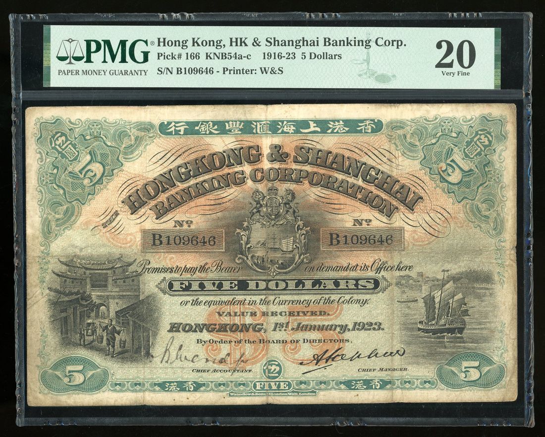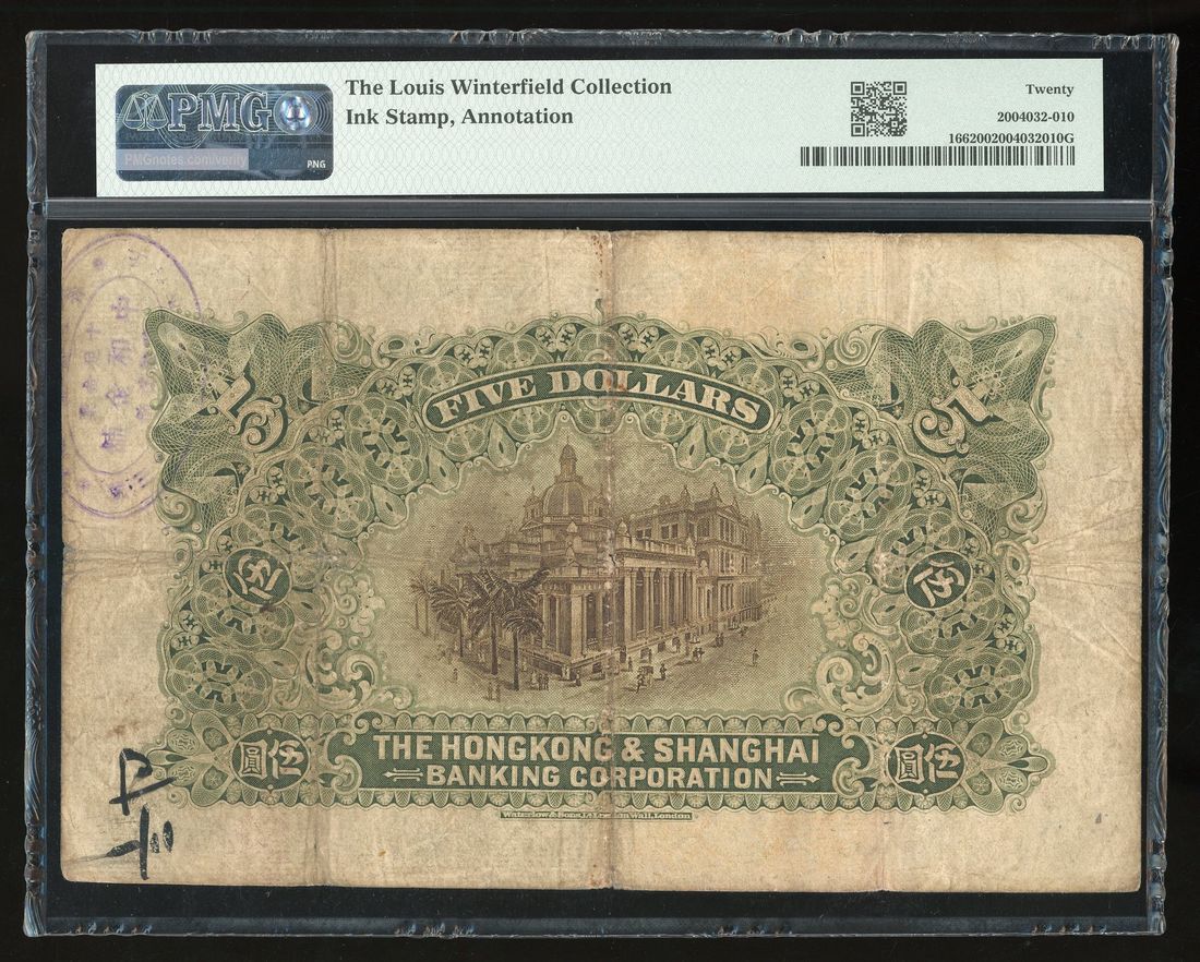 HongKong & Shanghai Banking Corporation, $5, 1.1.1923, serial number B109646, (Pick 166), PMG 20, ink, annotation. Ex-The Louis Winterfield Collection. An always popular type