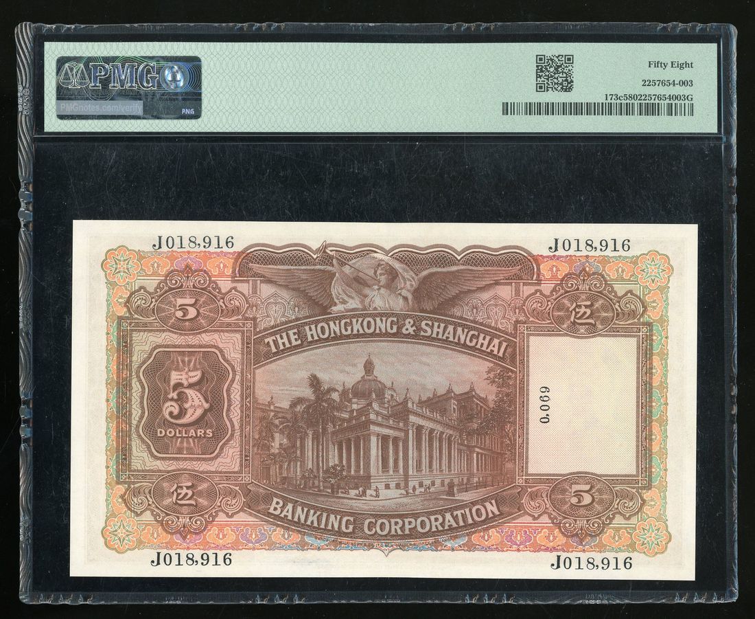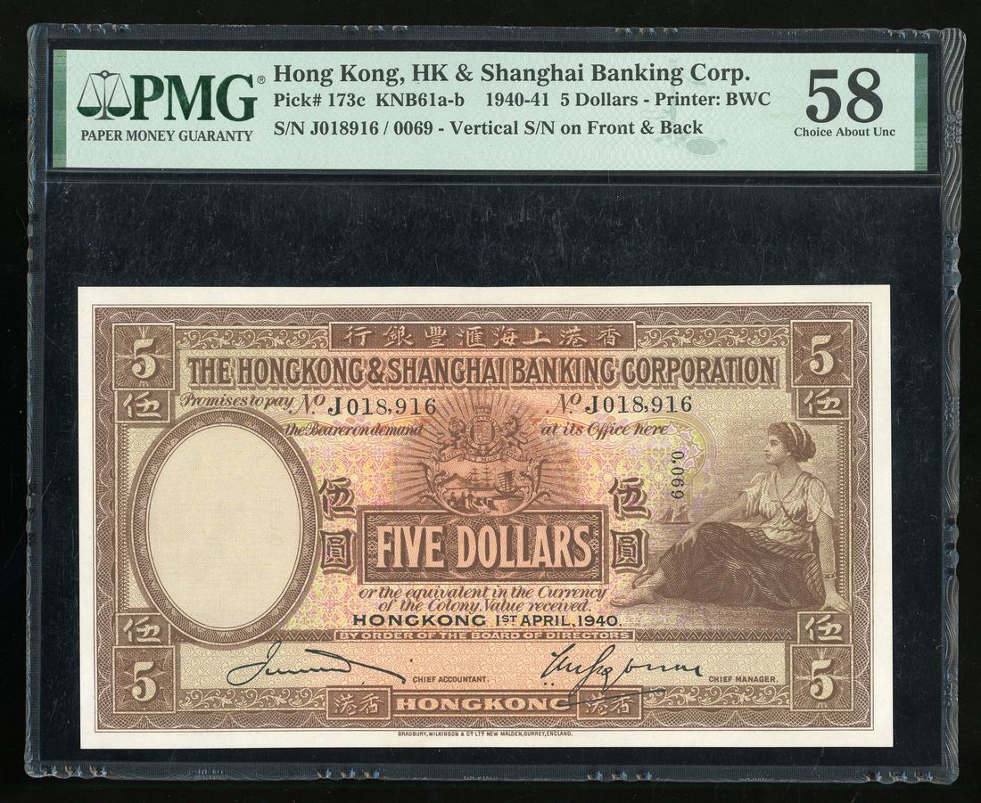 HongKong & Shanghai Banking Corporation, $5, DURESS NOTE, 1.4.1940, serial number J 018916, vertical number 0069,