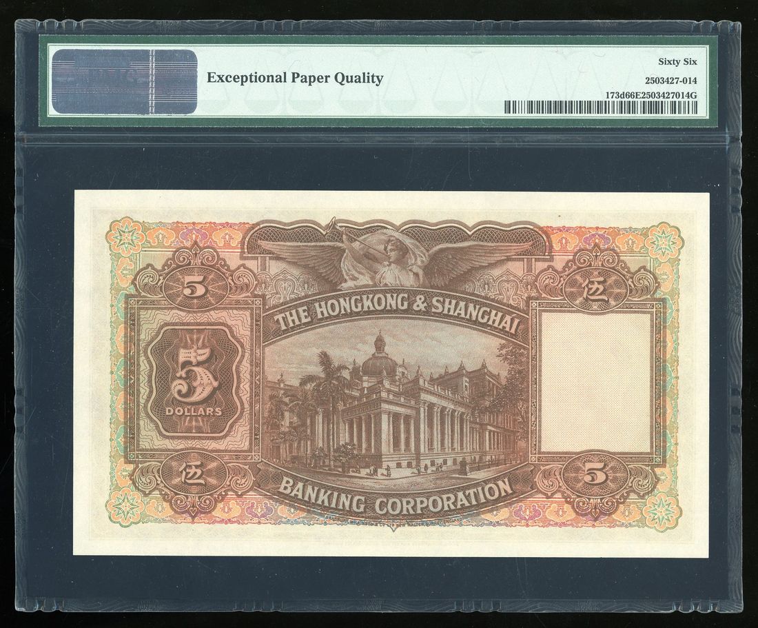 Hongkong & Shanghai Banking Corporation, $5, 1.4.1941, serial number P 403314, (Pick 173d), PMG 66EPQ, the second highest grade in the PMG census
