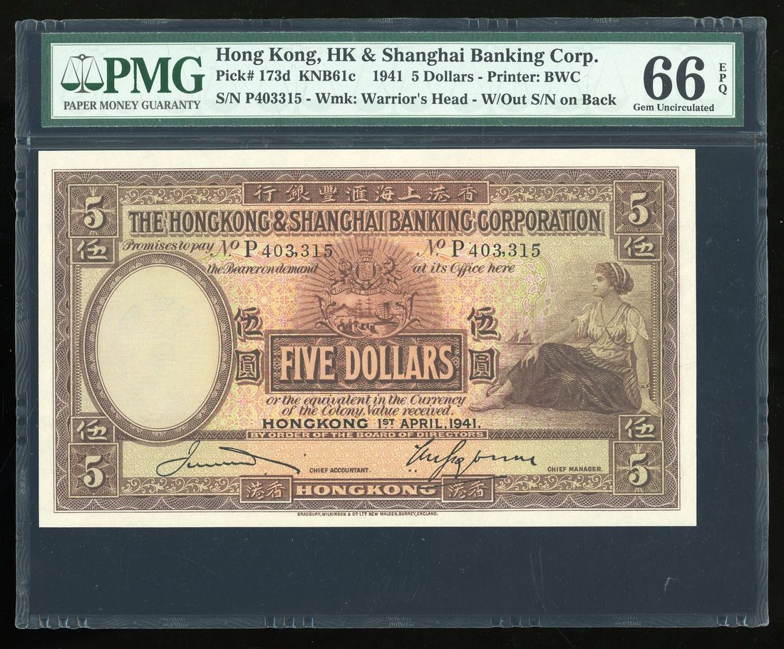 Hongkong & Shanghai Banking Corporation, $5, 1.4.1941, serial number P 403315, (Pick 173d), PMG 66EPQ, the second highest grade in the PMG census