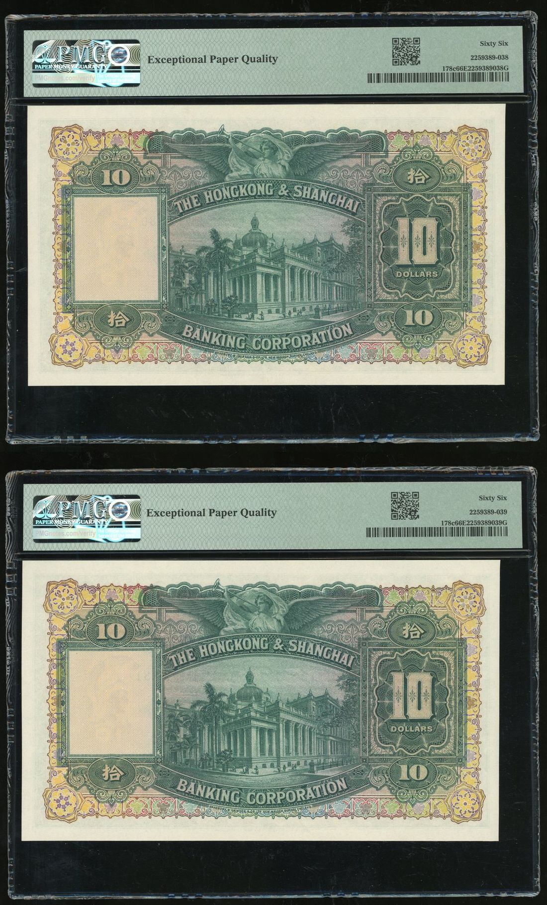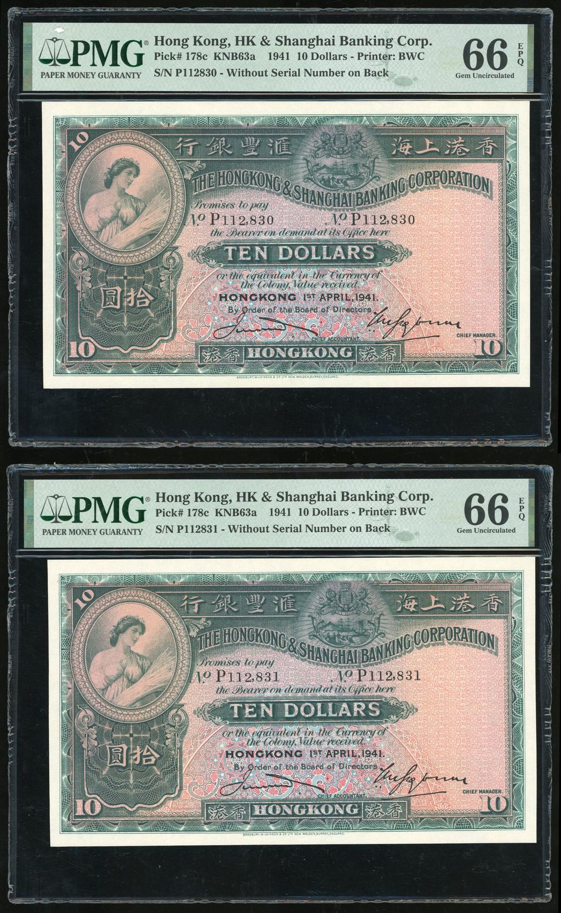 Hong Kong & Shanghai Banking Corporation, a pair of $10, 1st April, 1941, consecutive serial number P112830-1, (Pick 178c), both graded PMG 66EPQ.(2)
