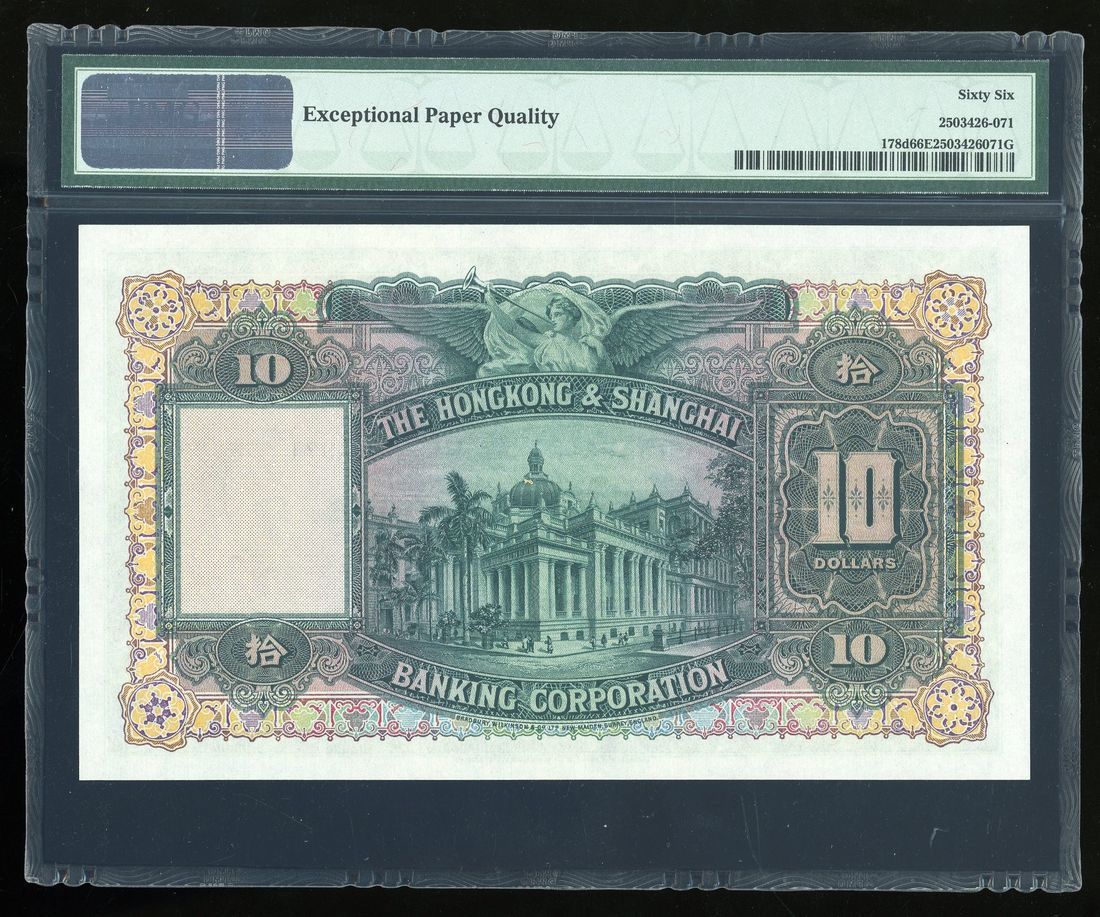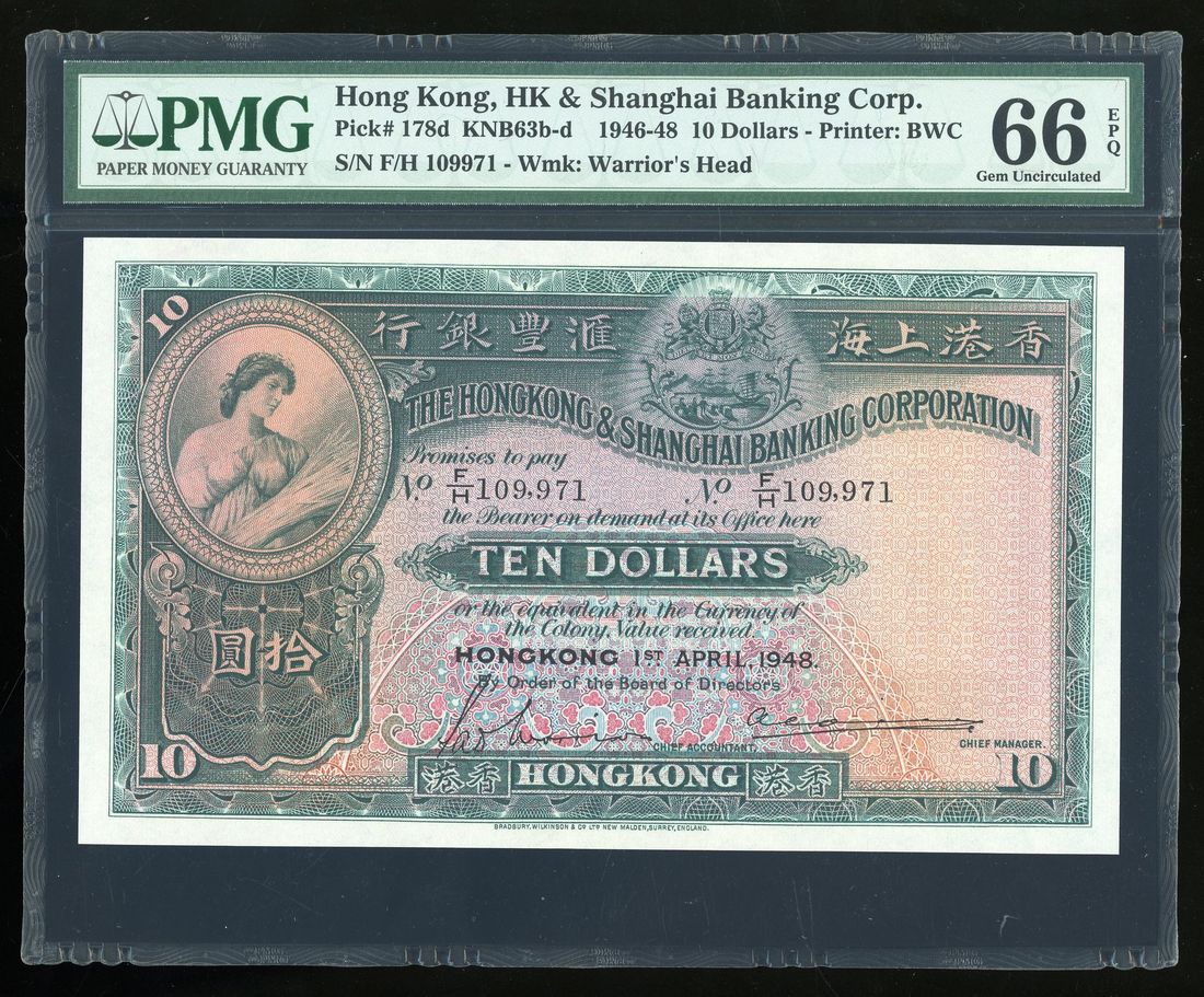 Hongkong & Shanghai Banking Corporation, $10, 1.4.1948, serial number F/H 109971, (Pick 178d), PMG 66EPQ