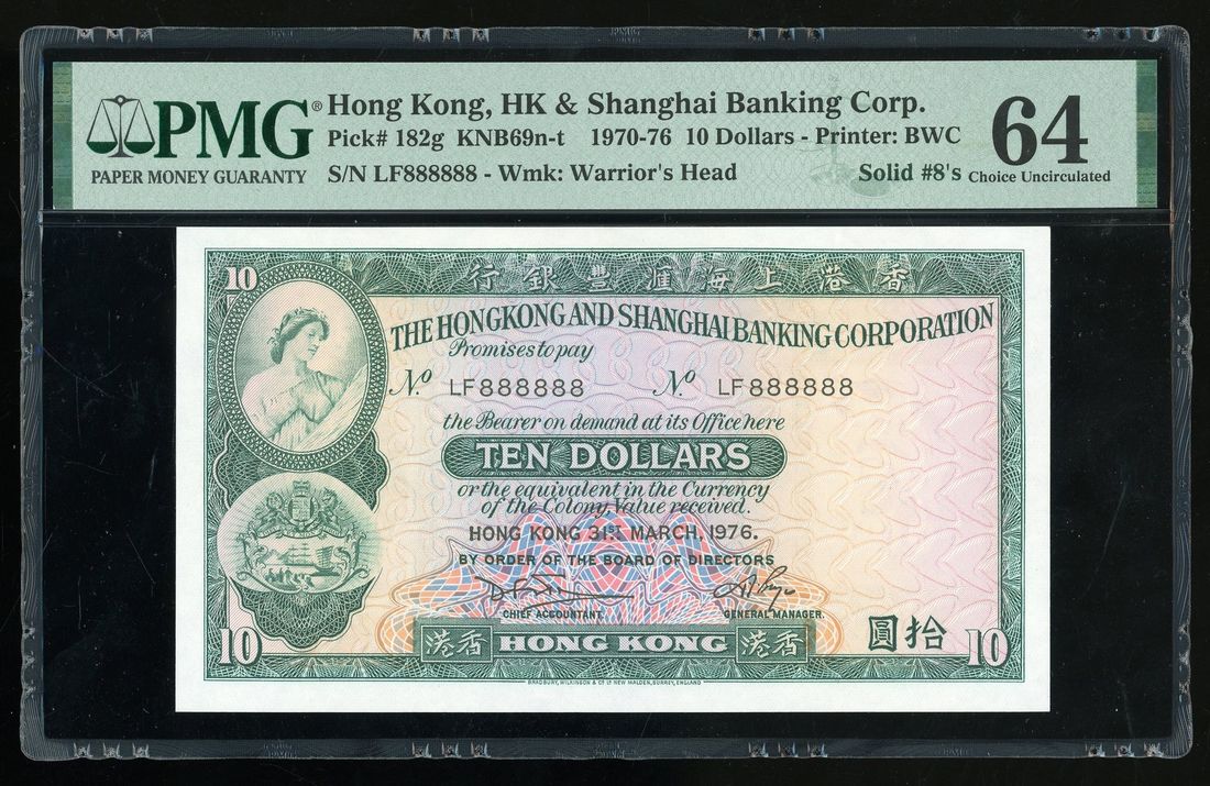 HongKong & Shanghai Banking Corporation, $10, 31.3.1976, solid serial number LF888888, (Pick 182g), PMG 64. Solid 8s!