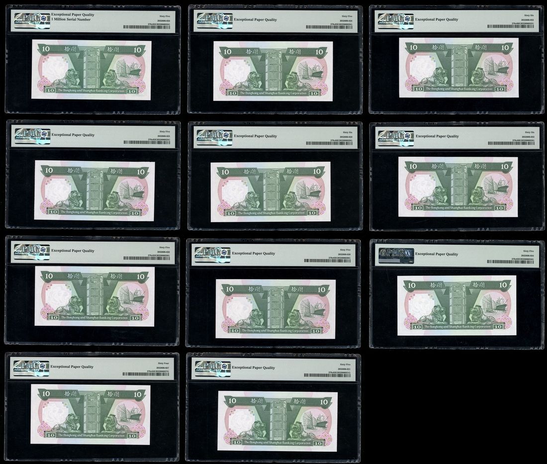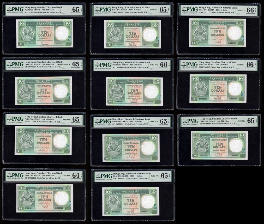 HongKong & Shanghai Banking Corporation, a set of fancy serial numbers $10 (11), 1.1.1990, including serial numbers, -CY000001, PMG 65EPQ,