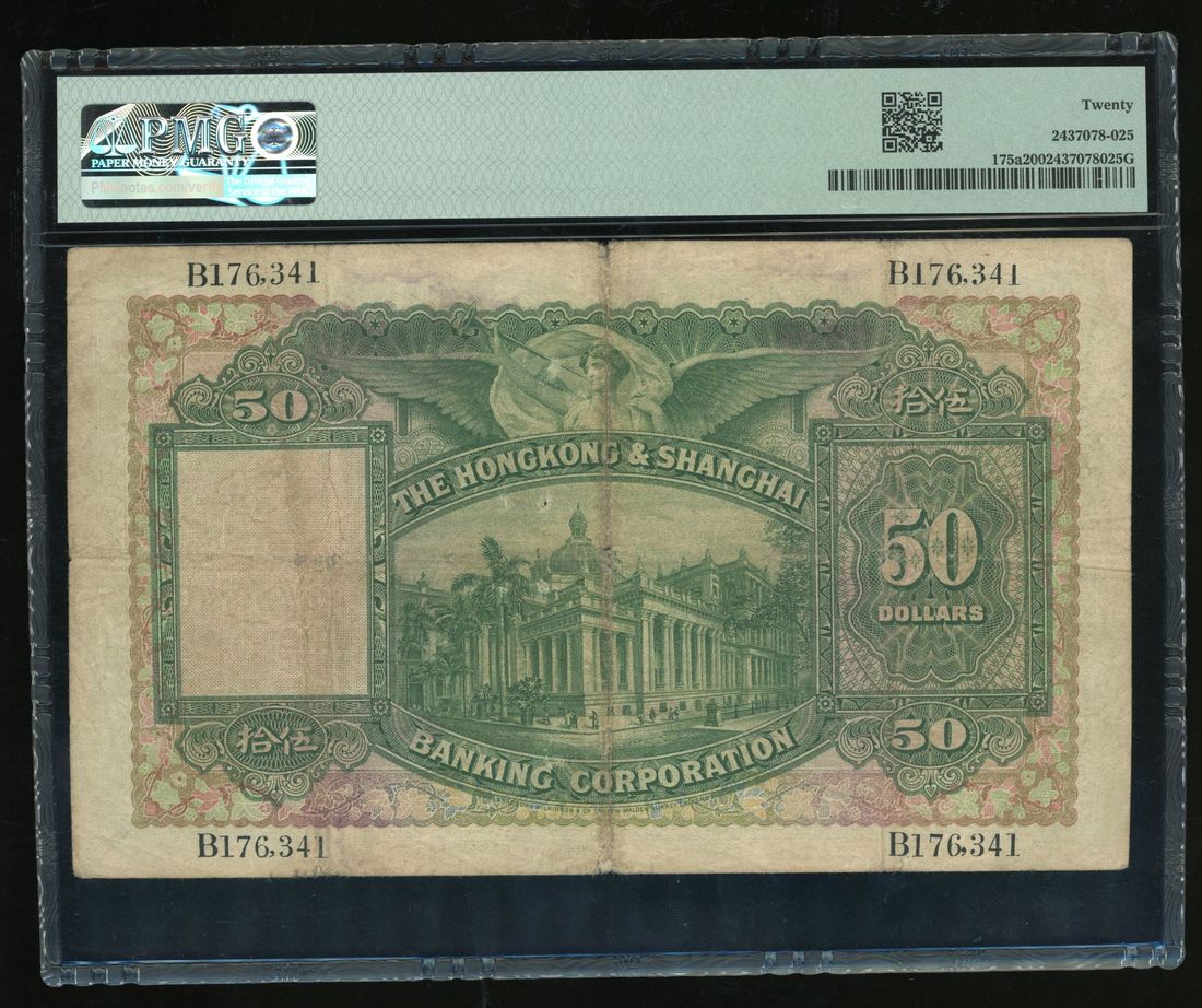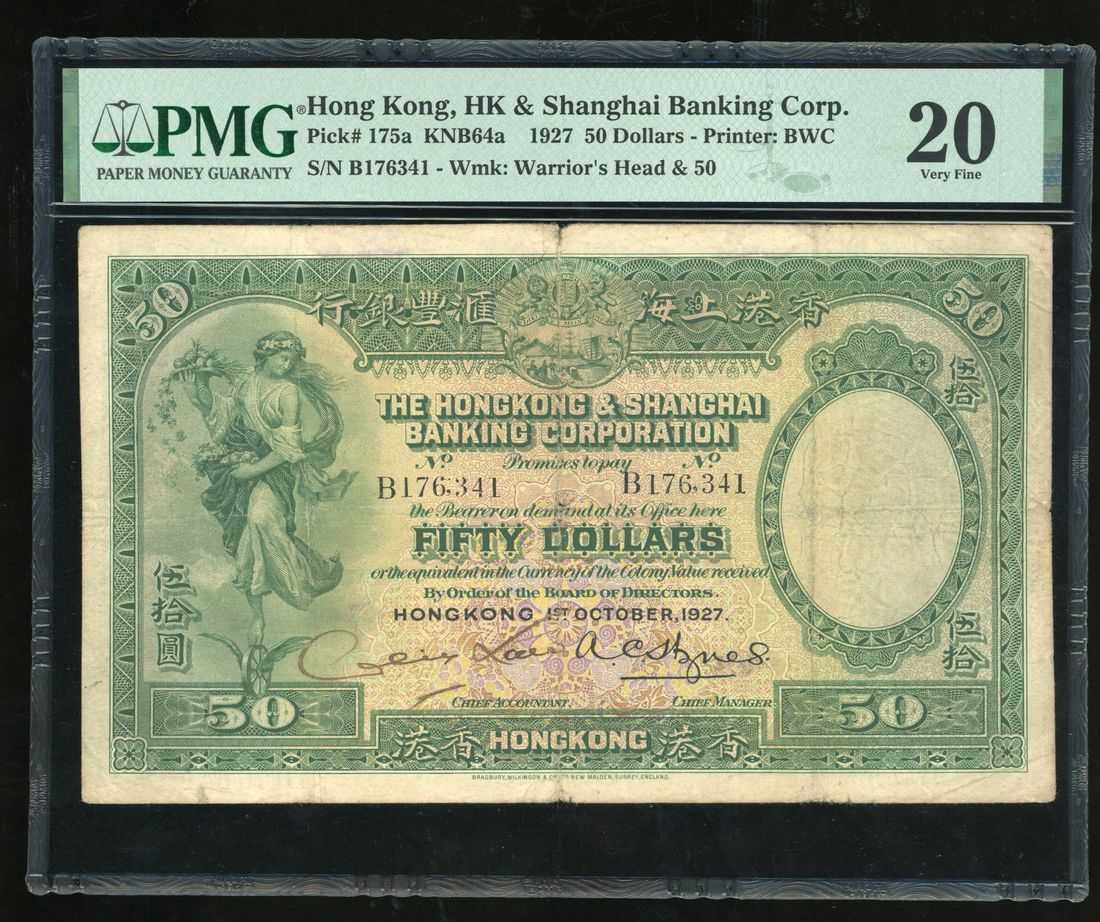 HongKong & Shanghai Banking Corporation, $50, 1.10.1927, serial number B176341, one handsigned signature,