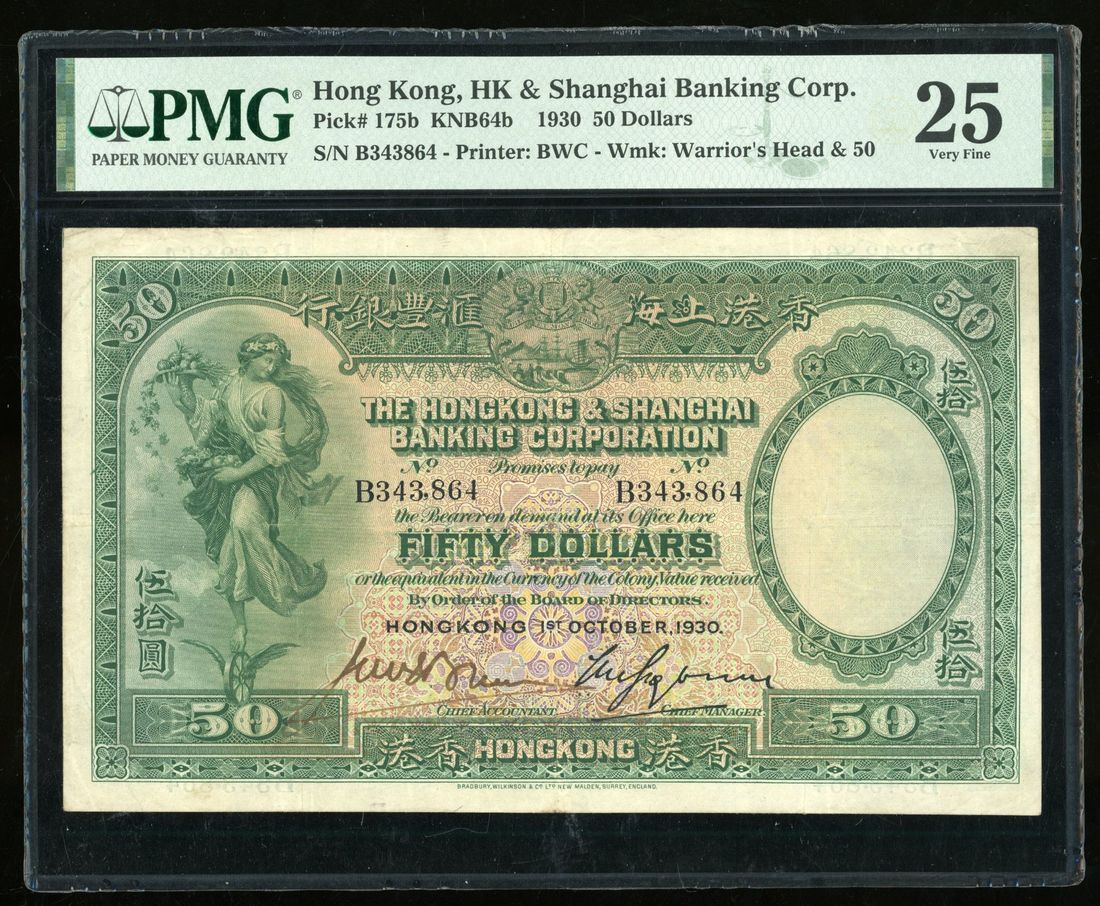 HongKong & Shanghai Banking Corporation, $50, 1930, serial number B343864, (Pick 175b), PMG 25, annotation. Attractive