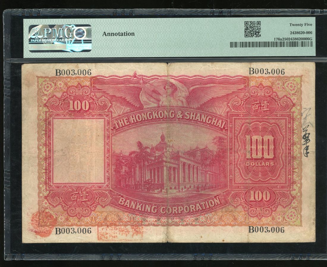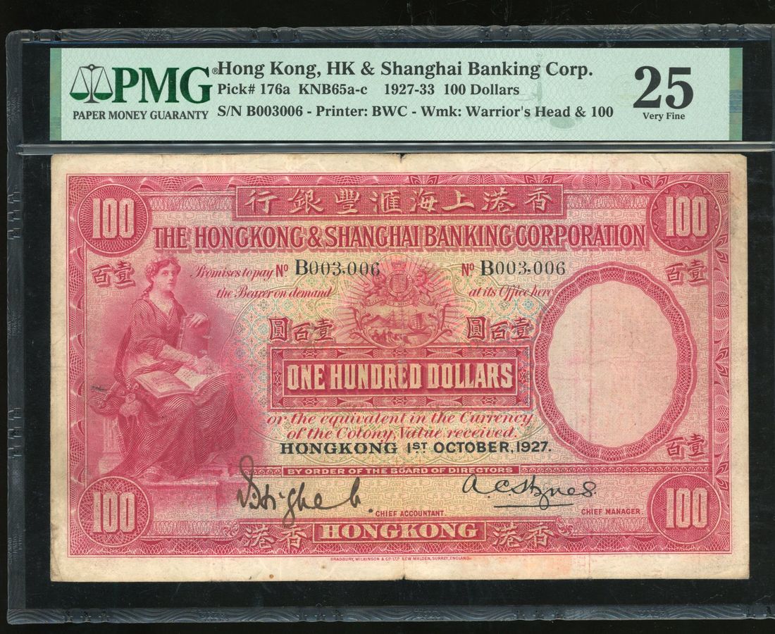 HongKong & Shanghai Banking Corporation, $100, 1.10.1927, serial number B003,006, one handsigned signature, printed Hynes signature,