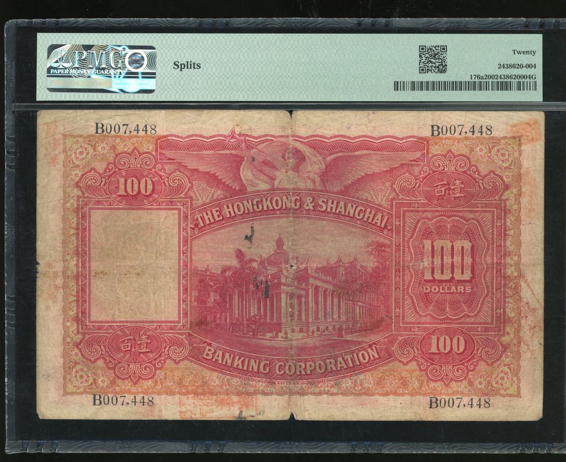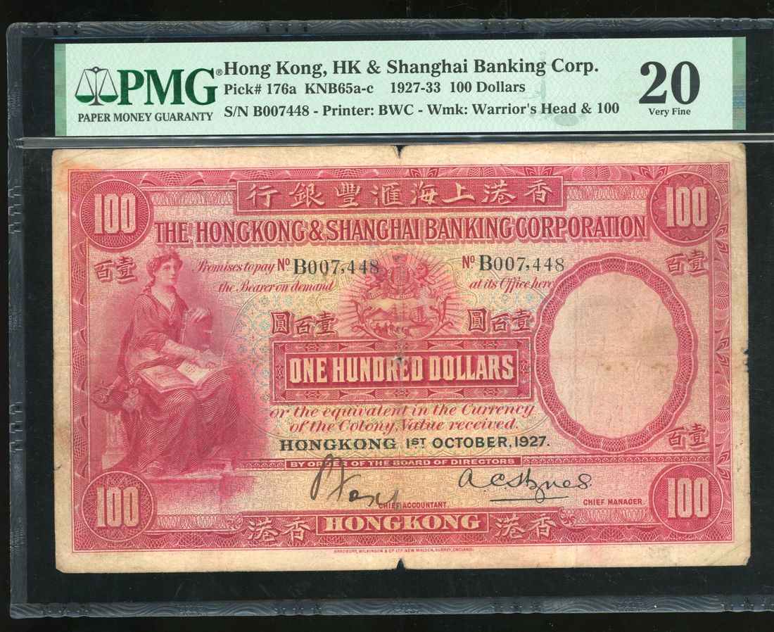 HongKong & Shanghai Banking Corporation, $100, 1.10.1927, serial number B007,448, one handsigned signature, printed Hynes signature,