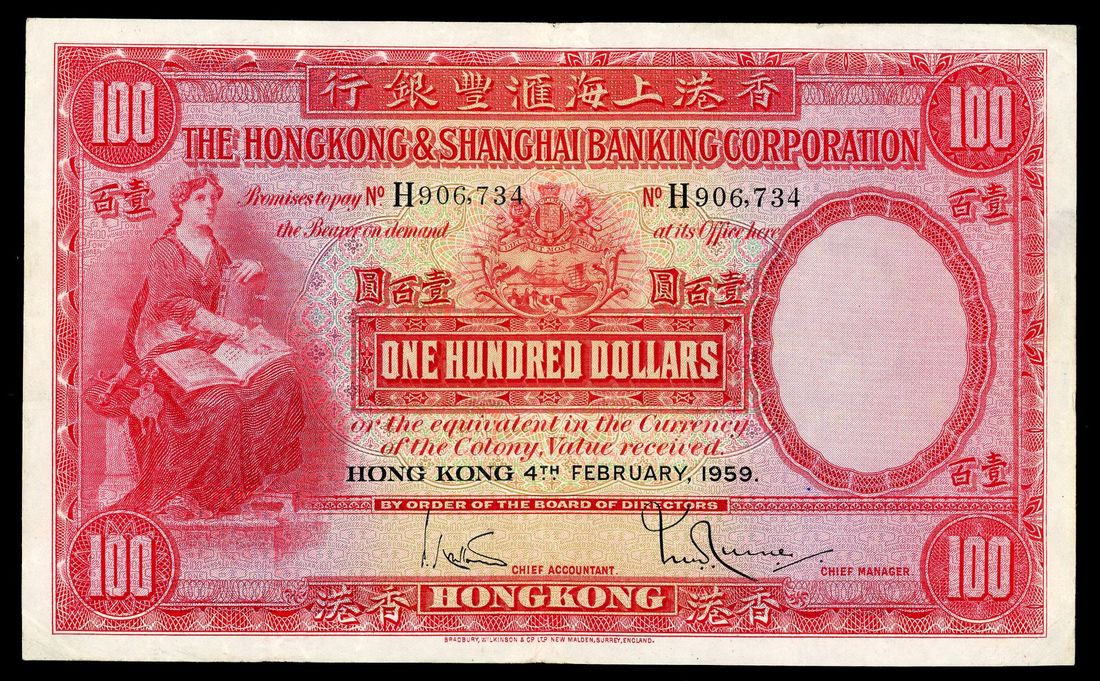 HongKong & Shanghai Banking Corporation, $100, 4.2.1959, serial number H906734, (Pick 176g), good very fine. Scarce last date issue