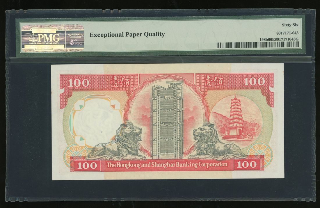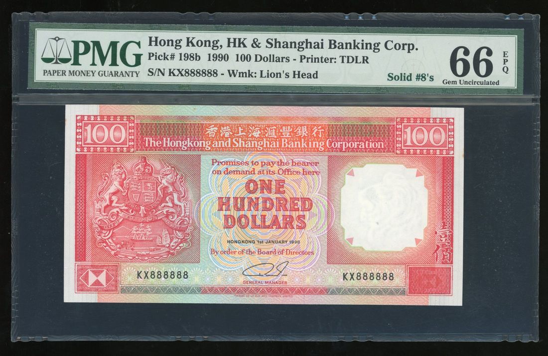 HongKong & Shanghai Banking Corporation, $100, 1.1.1990, solid serial number KX888888, (Pick 198b), PMG 66EPQ. Lucky serial number on a less often seen type