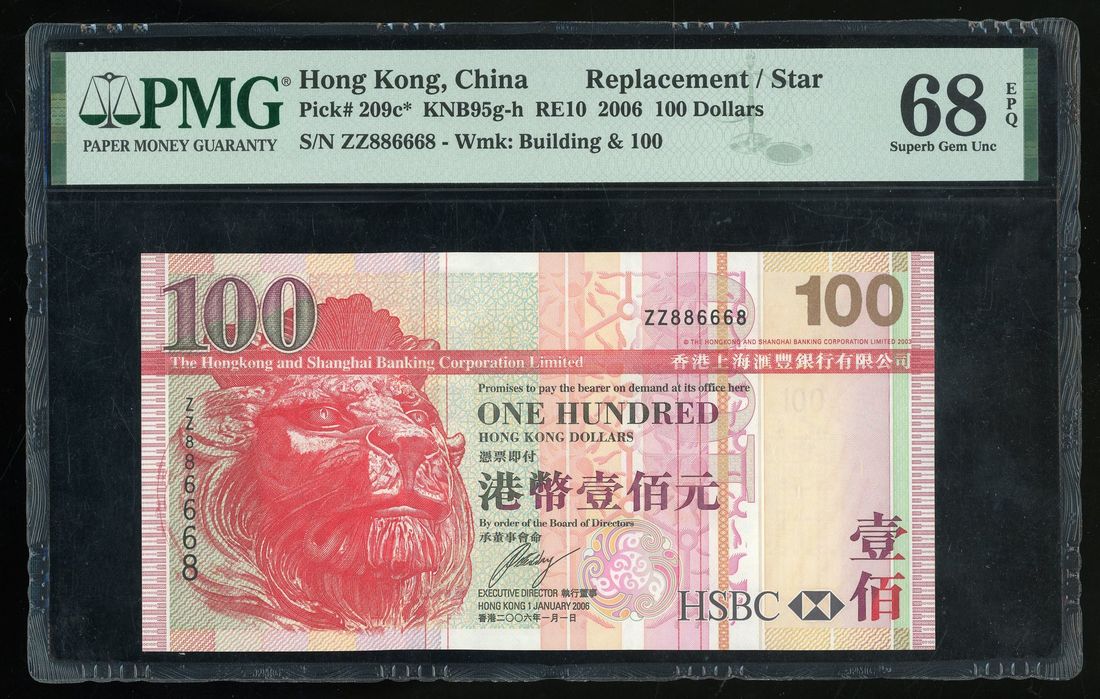 HongKong & Shanghai Banking Corporation, replacement $100, 1.1.2006, serial number ZZ886668, (Pick 209c*), PMG 68EPQ