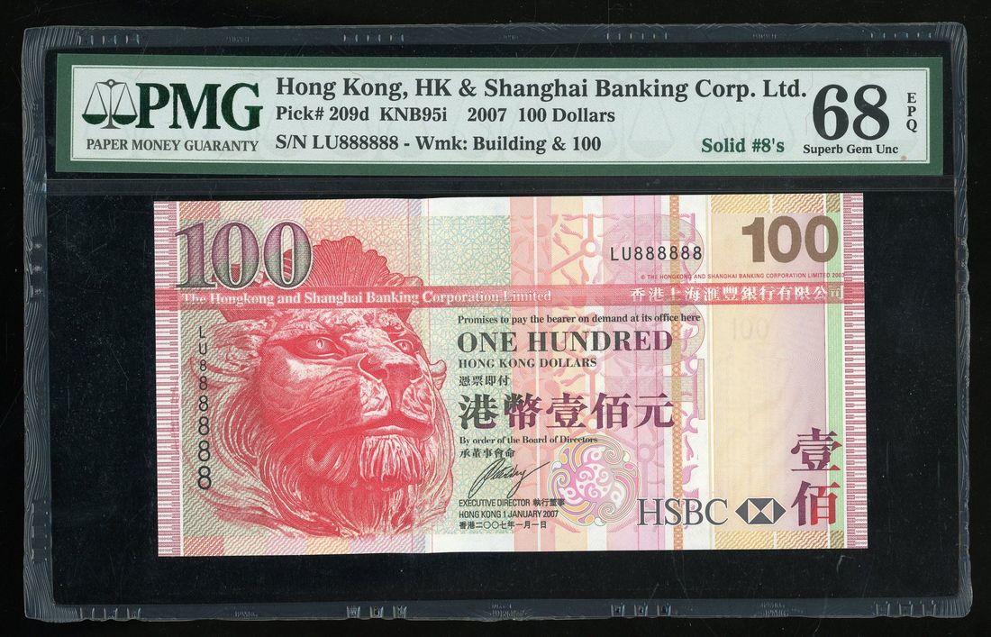 Hongkong & Shanghai Banking Corporation, $100, 1.1.2007, solid serial number LU 888888, (Pick 209b), PMG 68EPQ
