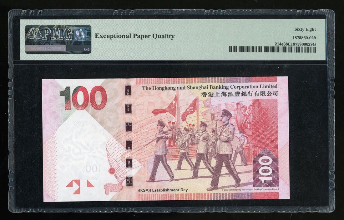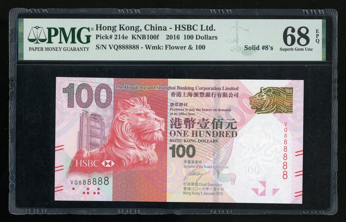 Hongkong & Shanghai Banking Corporation, $100, 1.1.2016, solid serial number VQ 888888, (Pick 214e), PMG 68EPQ