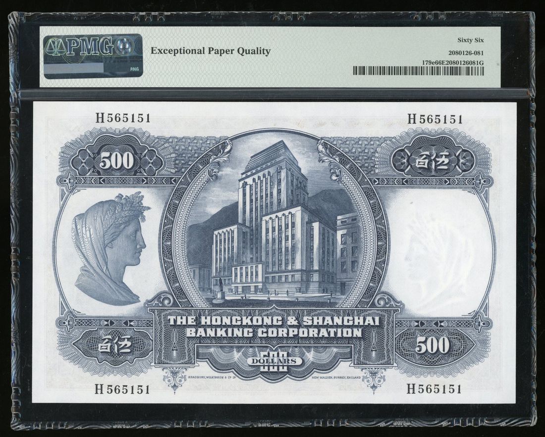 HongKong & Shanghai Banking Corporation, $500, 11.2.1968, serial number H565151, (Pick 179e), PMG 66EPQ. Though a common type but still tough to see a high grade uncirculated example
