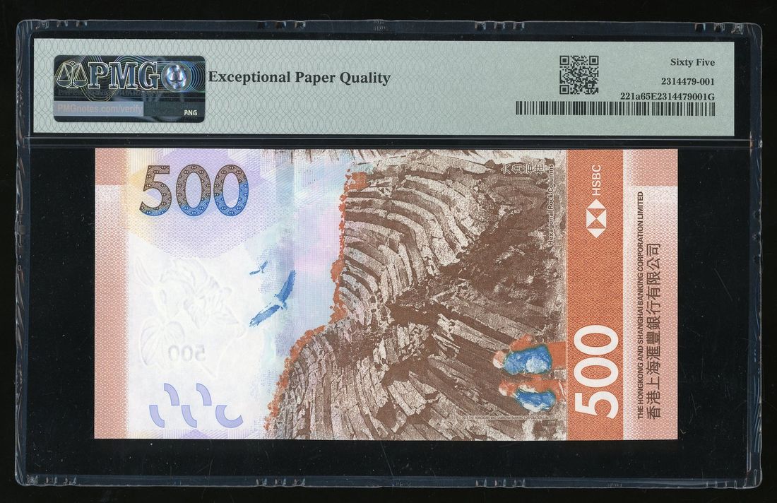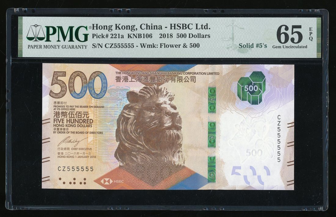 Hongkong & Shanghai Banking Corporation, $500, 1.1.2018, solid serial number CZ 555555, (Pick 221a), PMG 65EPQ
